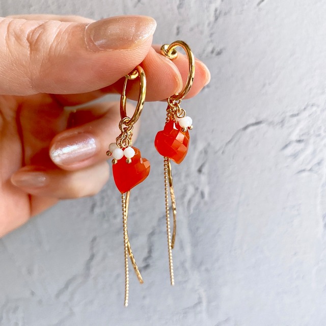 7月の誕生石でもあるカーネリアン。 トロピカルフルーツのような瑞々しいオレンジ色が魅力で、 お守りとしても人気のある天然石です。 斜めに仕立てられたハートカットは甘くなりすぎず、 さりげなく大人っぽい雰囲気を演出してくれます。 カーネリアンに添えたのはホワイトコーラル(白珊瑚)。 真っ白すぎない温もりのあるホワイトカラーで、 優しいニュアンスを加えてくれています。 軽やかに揺れるウェーブスティックを合わせて スタイリッシュな遊び心をプラスしました。 juicyなオレンジカラーは夏のバカンスにはもちろん、 紅葉のお出かけシーズンにもオススメです◎ 全長*約8センチ(フープ1.5センチ、フープ下6.5センチ) 素材*カーネリアン/ホワイトコーラル 夏/海/オレンジ/お呼ばれ/天然石/14kgf/マーブル/淡水パール/パール/ゴールド/プレゼント/誕生日プレゼント/誕生日石/まる/花/チェコビーズ/アースカラー/モノトーン/差し色/高見えコーデ/バロックパール/シック//珊瑚