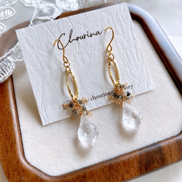 すりガラスみたいな水晶とトルマリンのイヤリング/ピアス