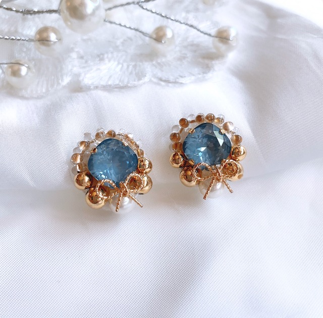 【ヴィンテージネイビー】くすみクリスタル&リボンの刺繍イヤリング/ピアス