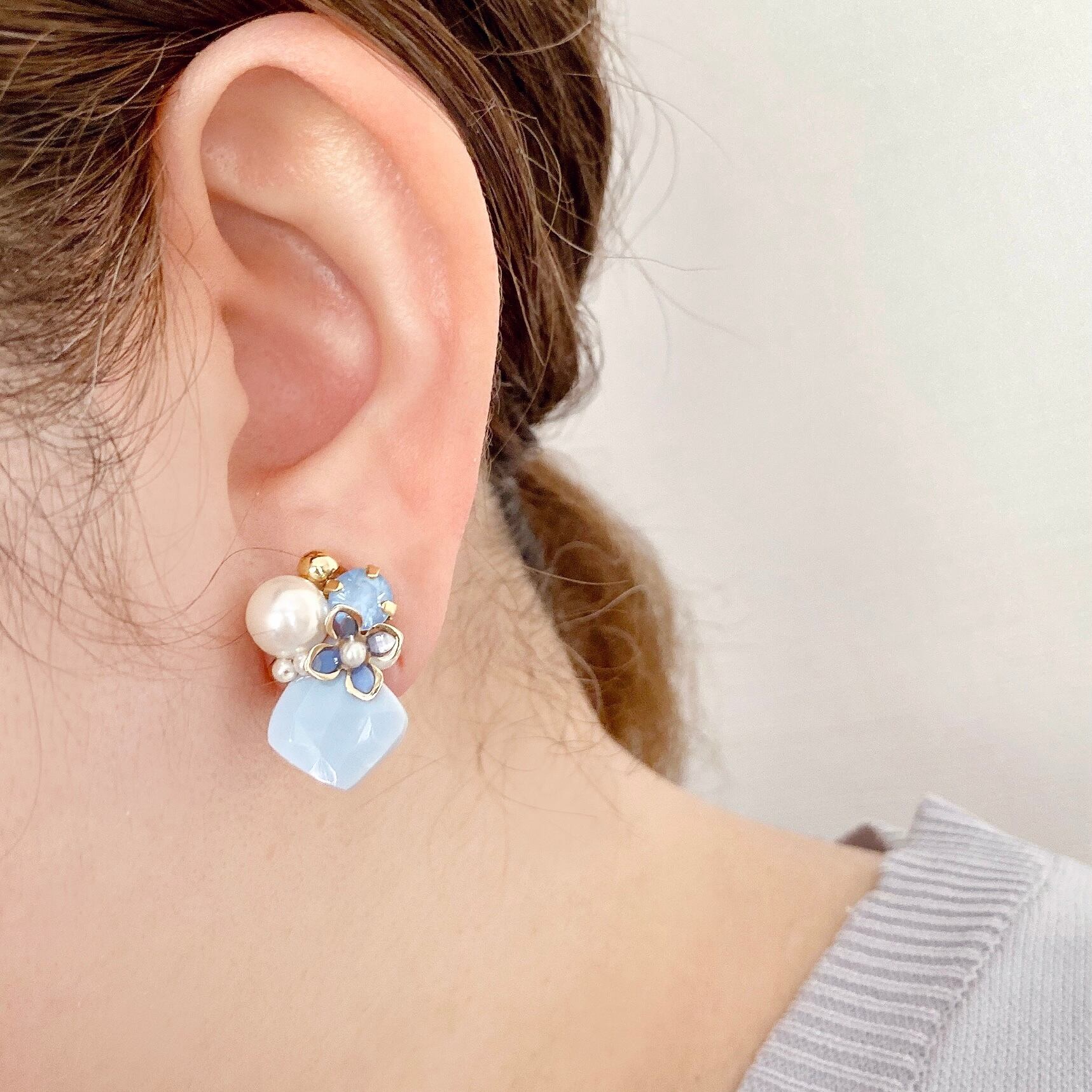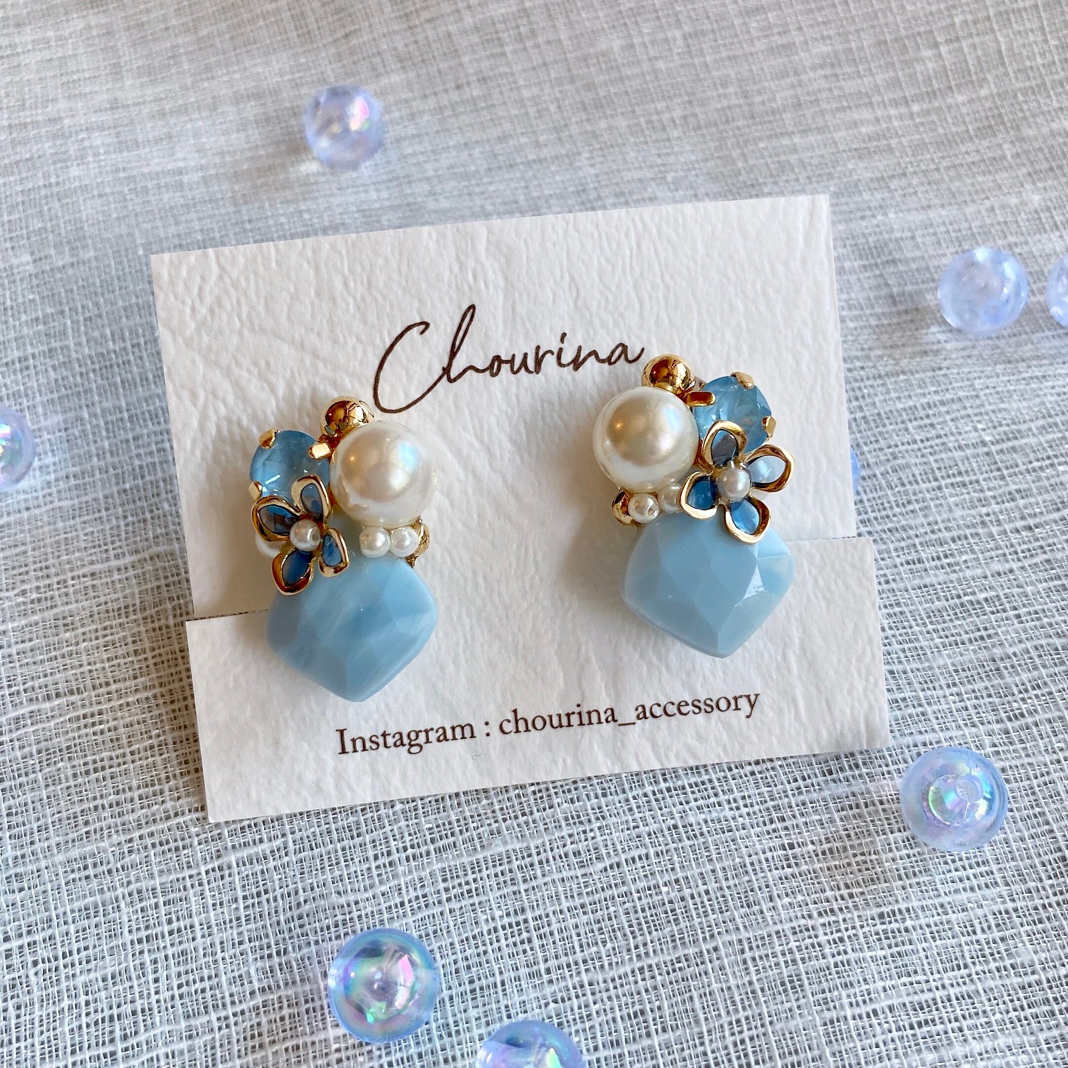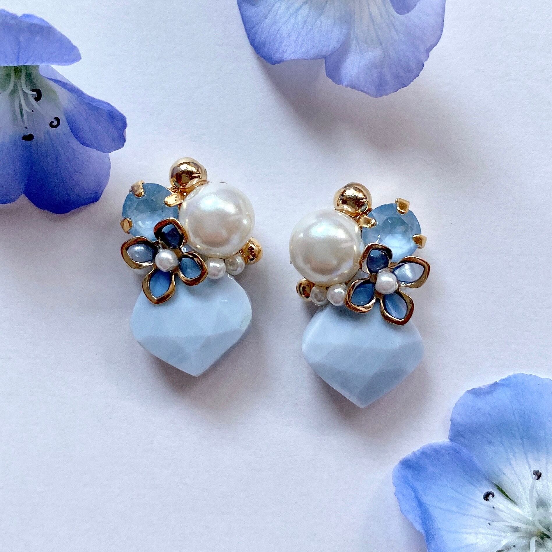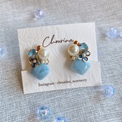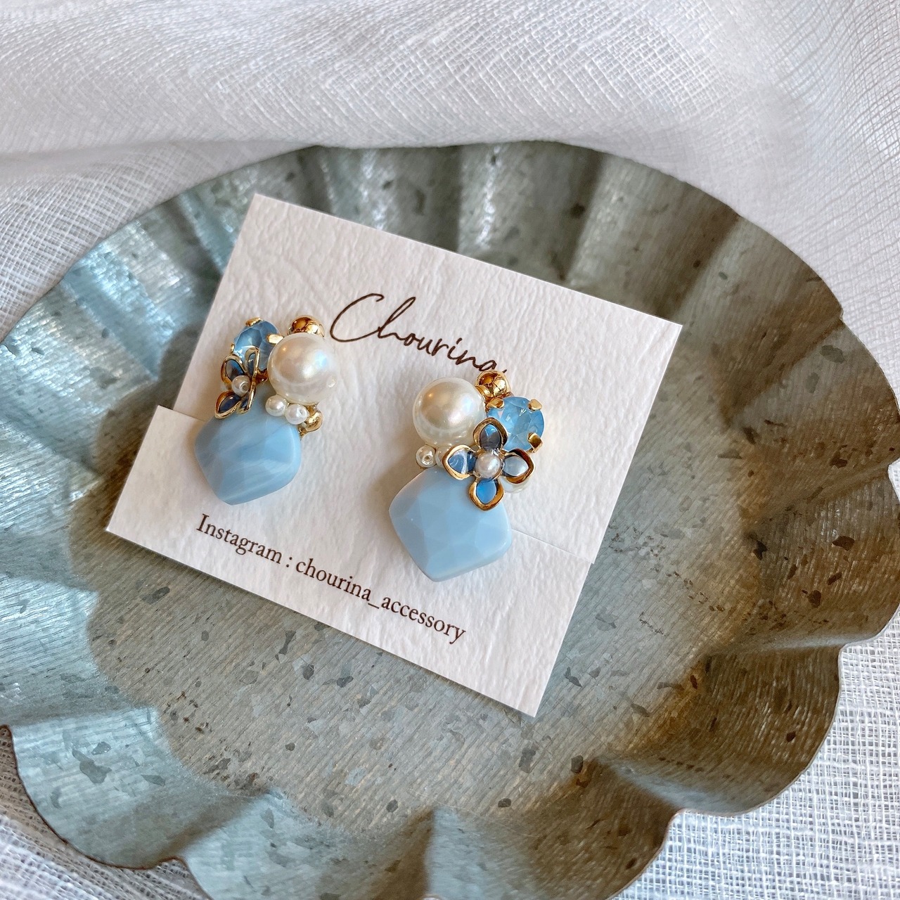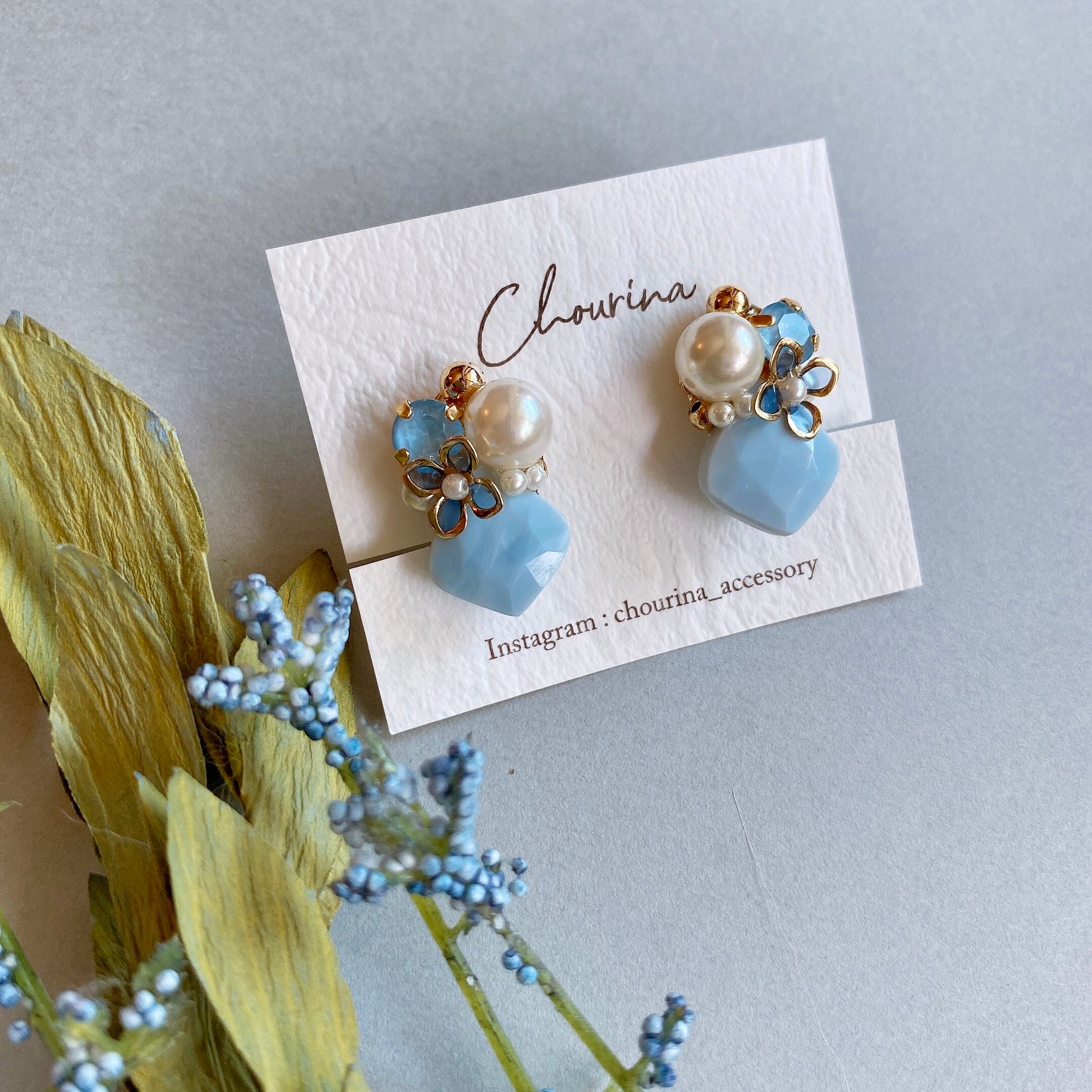 淡いブルーのクリスタルにパールを添えて優しい雰囲気に。