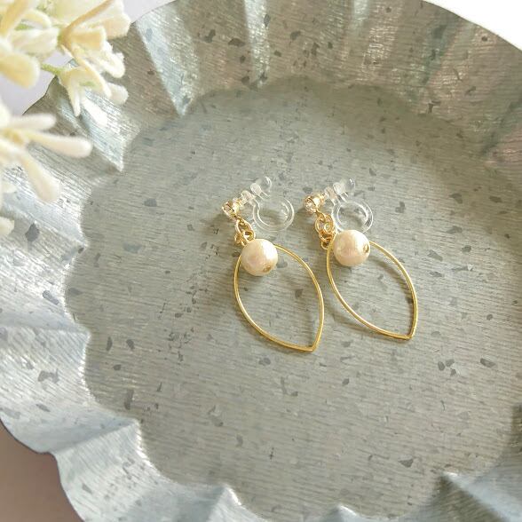 ゴールドのマーキス型の中に、ちょこんとコットンパールを飾りました。