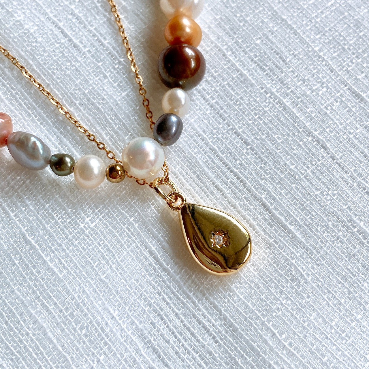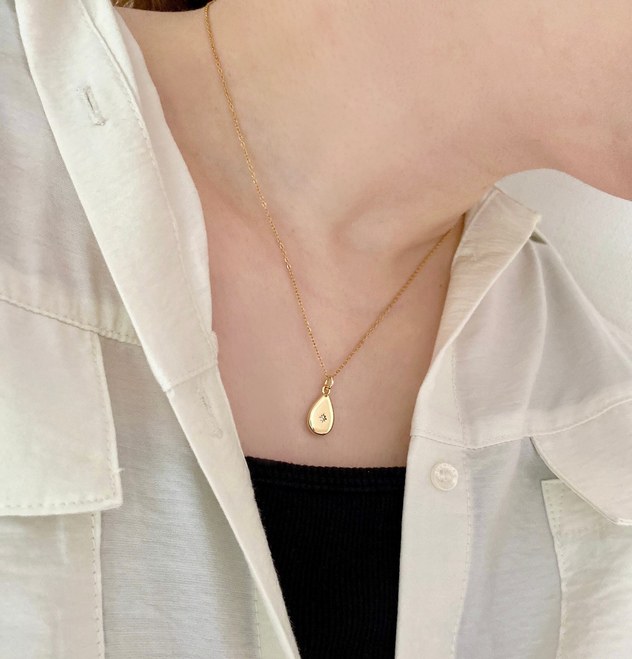 中央に一粒のジルコニアが煌めくティアドロップネックレス。