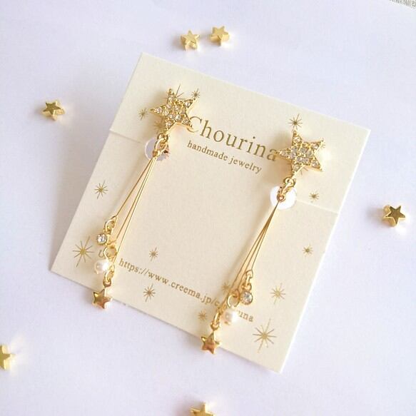華奢なワイヤーでパールやビジュー、ゴールドスターを飾りました。