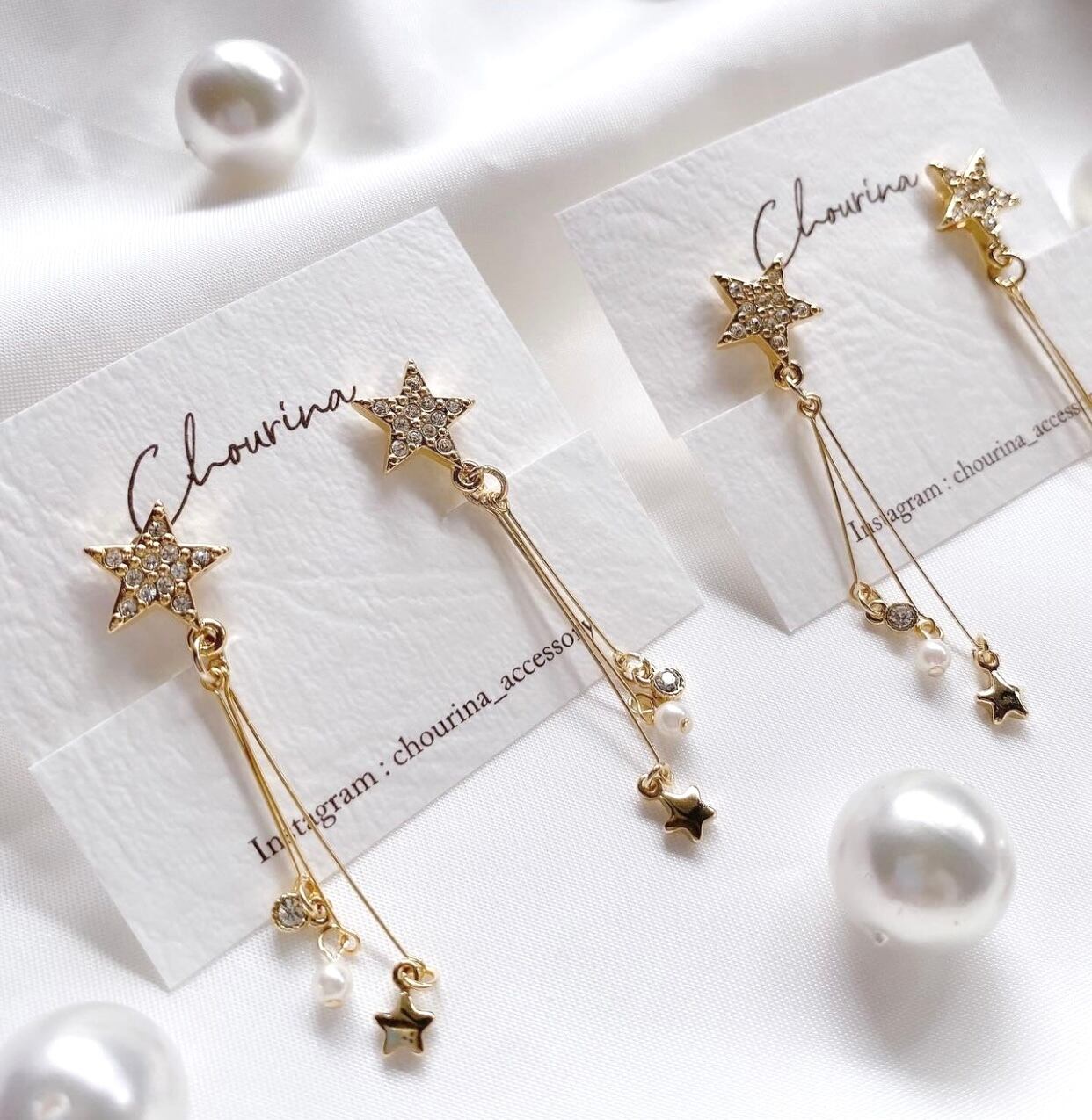 夜空に輝く流れ星をイメージしたイヤリング/ピアスです。
