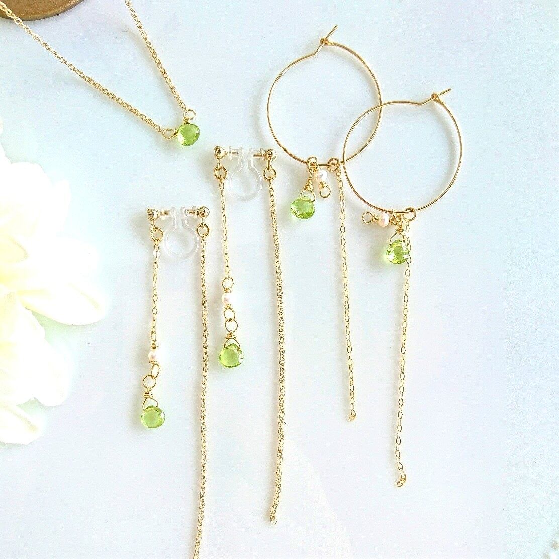 淡いグリーンの宝石質のペリドットは透明度が高く、まるで朝露に濡れた若葉のような煌めきです。