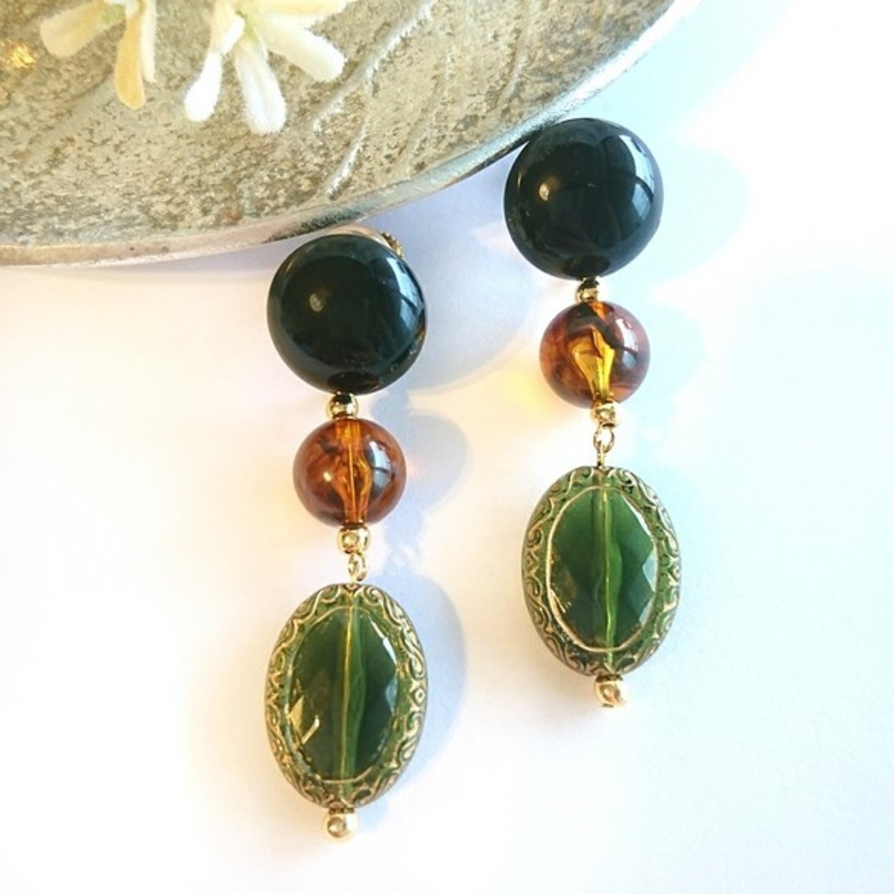 アンティークビーズイヤリング/ピアス(オリーブ×べっ甲)/ハンドメイド