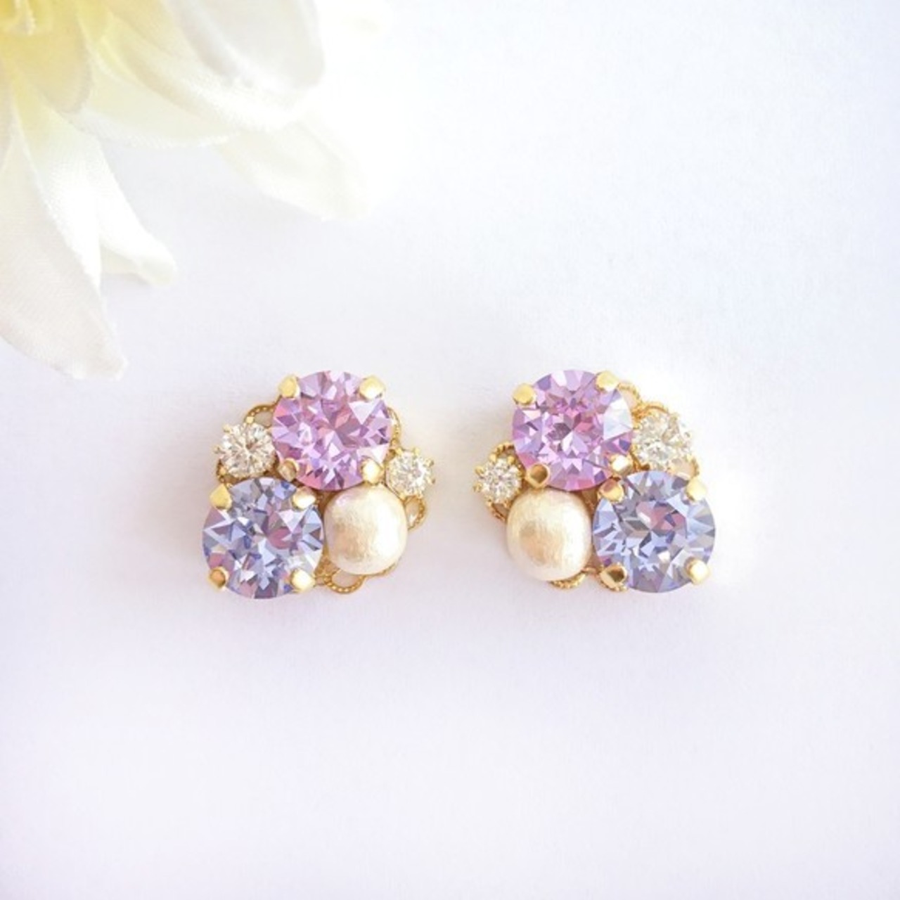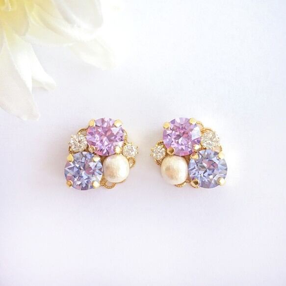 2色のスワロフスキーとジルコニア、コットンパールの組み合わせが華やかなイヤリングです。