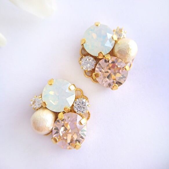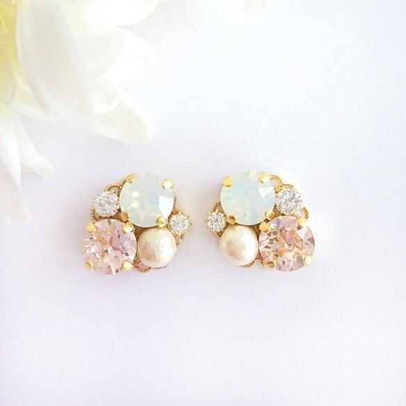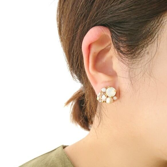 2色のスワロフスキーとジルコニア、コットンパールの組み合わせが華やかなイヤリングです。
