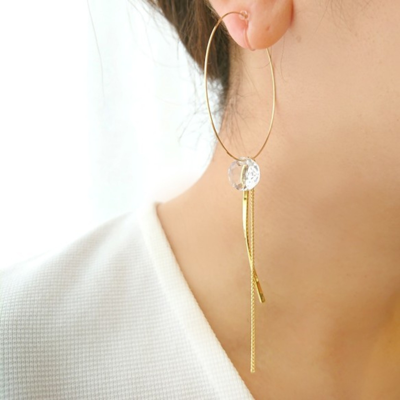 スワロフスキーとゴールドスティック&チェーンを組み合わせたノンホールピアス(イヤリング)です。