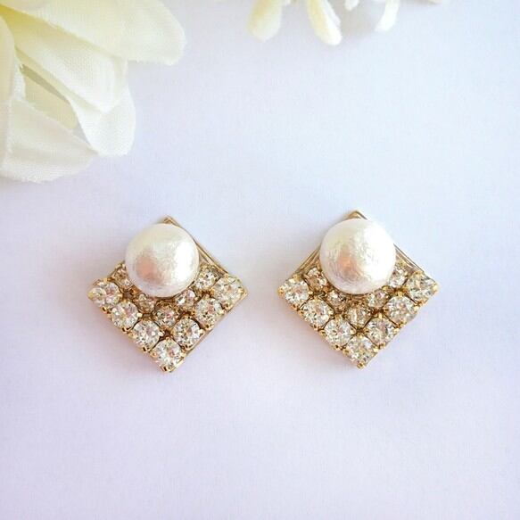 優しい質感のコットンパールとクリスタルの輝きが耳元を飾ります。