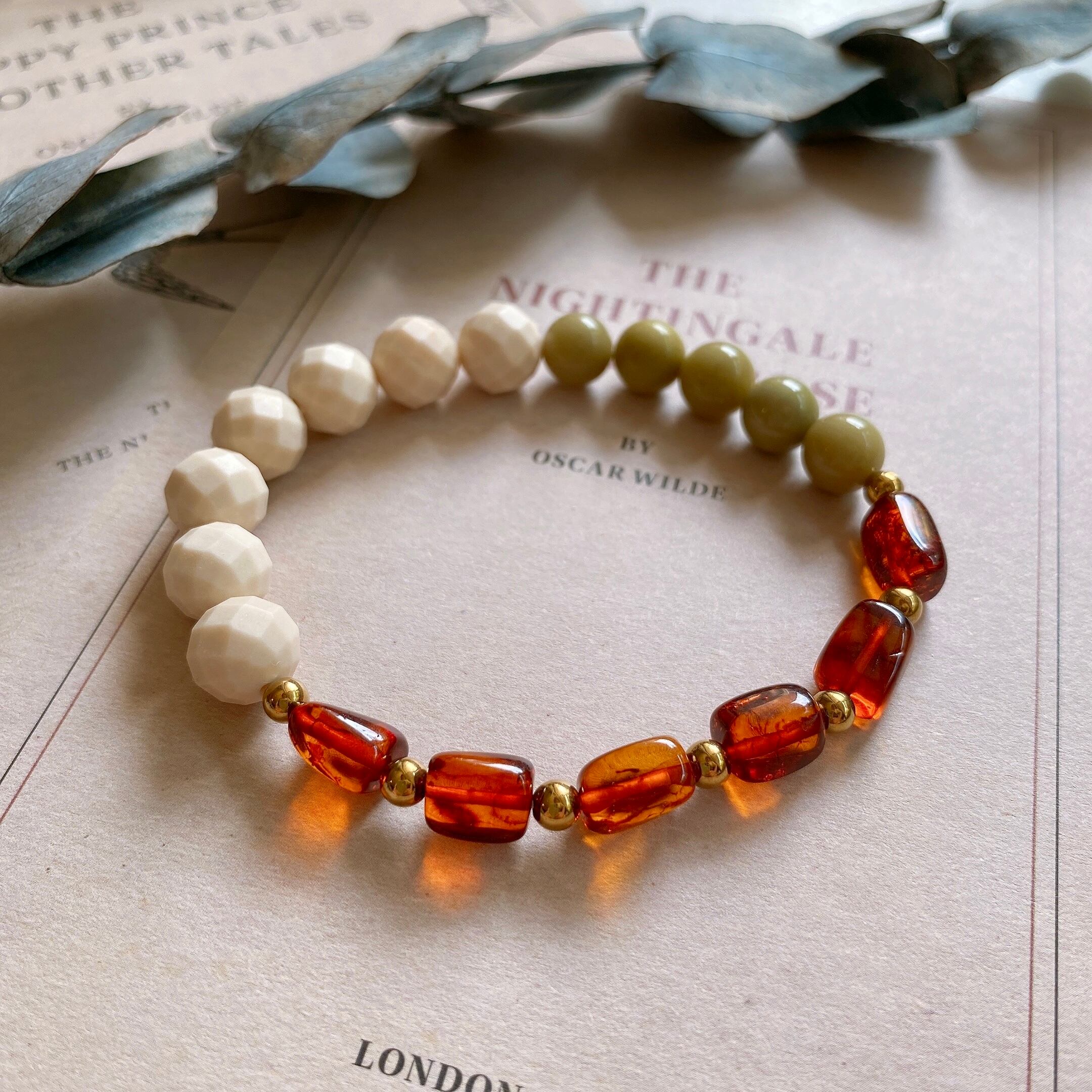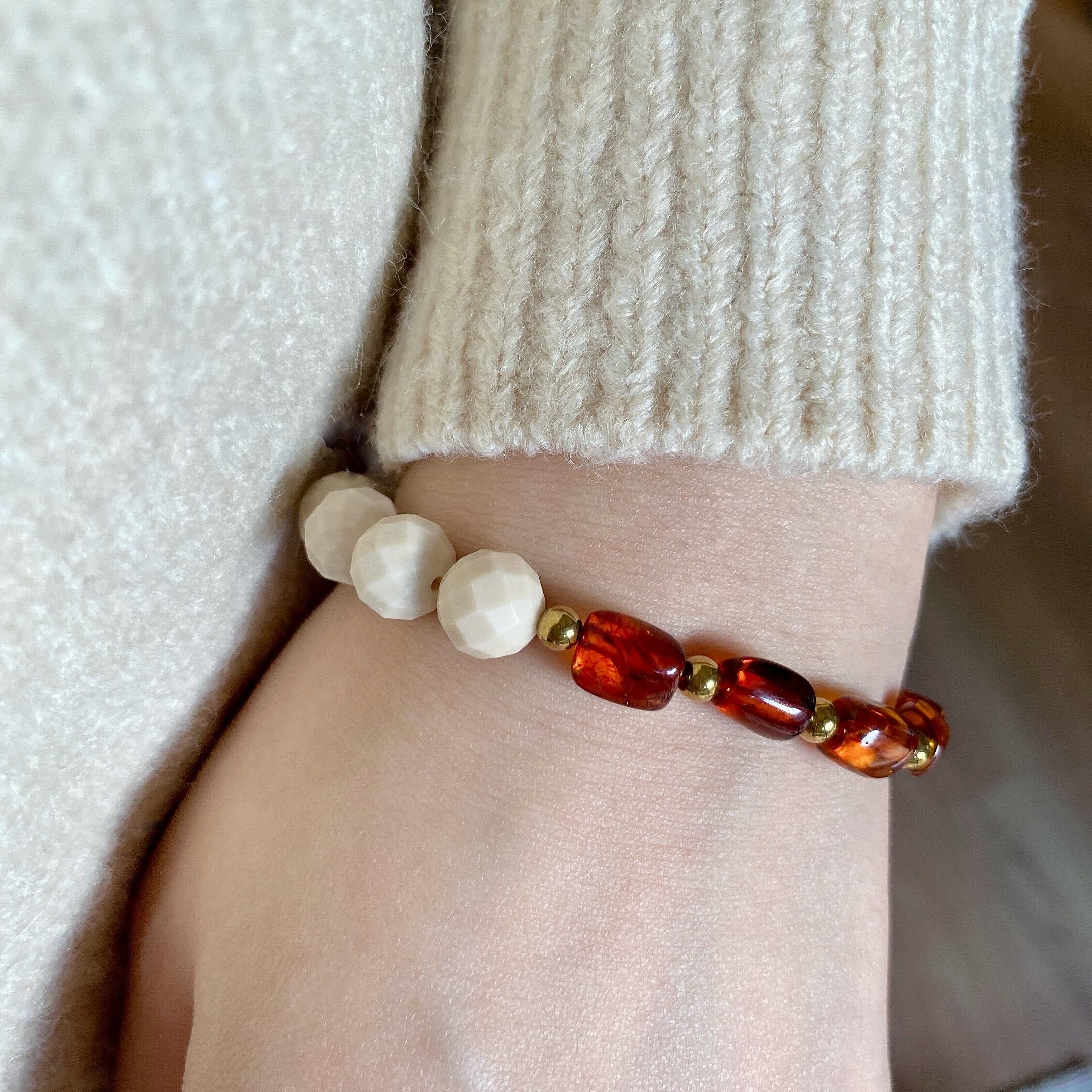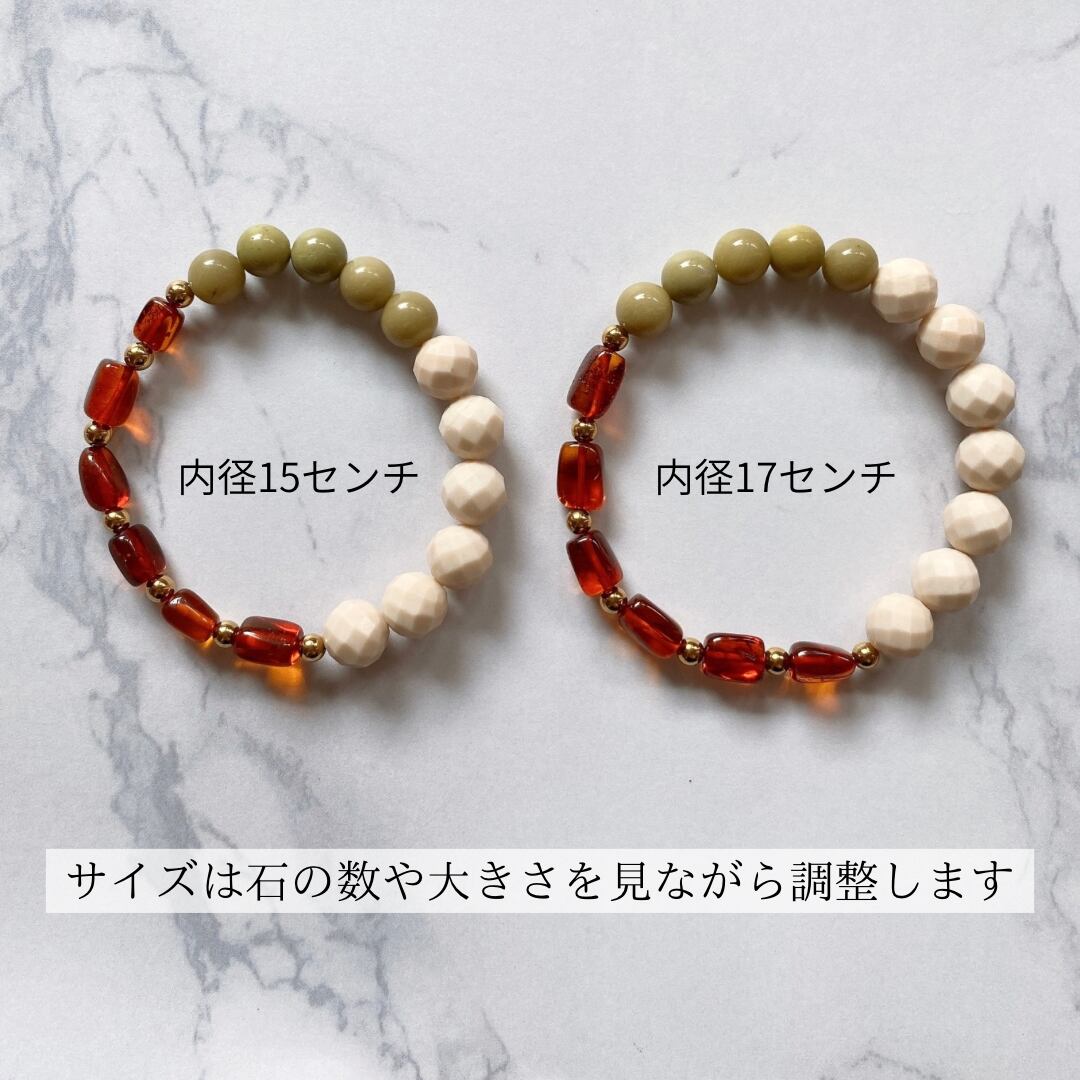 琥珀/金属アレルギー対応/アラシャンアゲート/天然石/くすみカラー/マーブル/淡水パール/パール/ゴールド/プレゼント/誕生日プレゼント/誕生日石/まる/花/チェコビーズ/アースカラー/モノトーン/差し色/ゴムブレス/パール/華奢