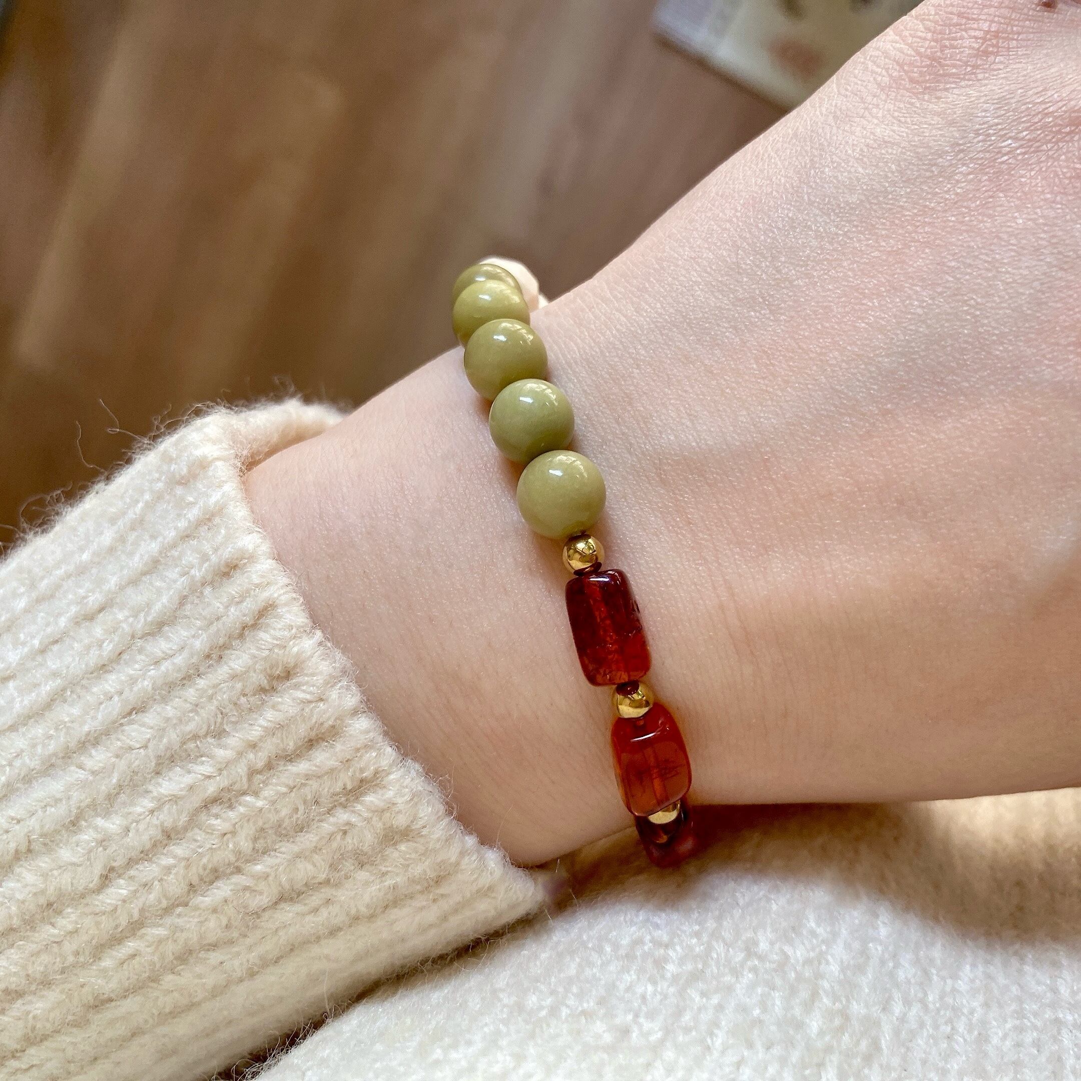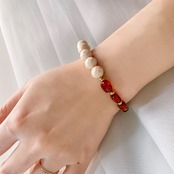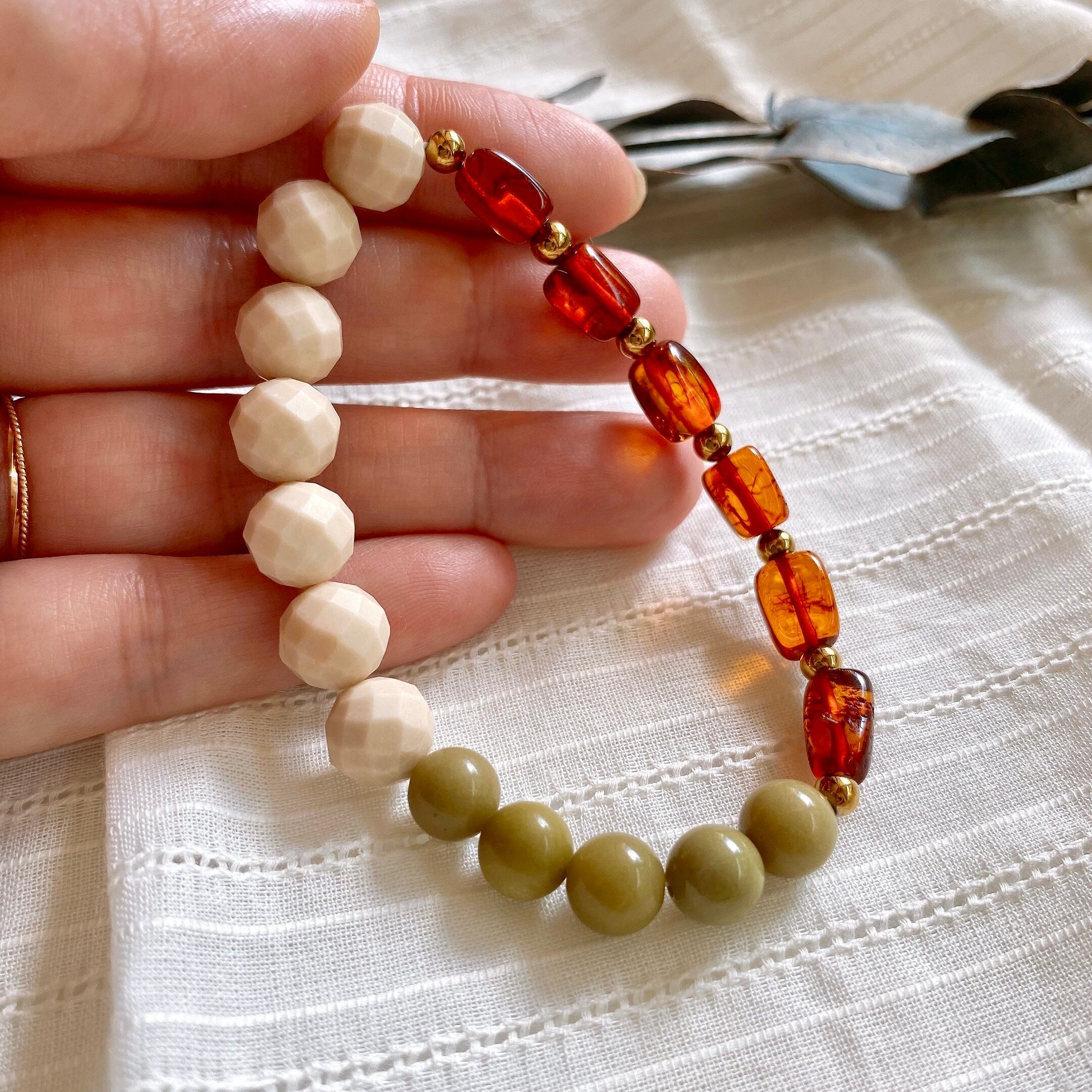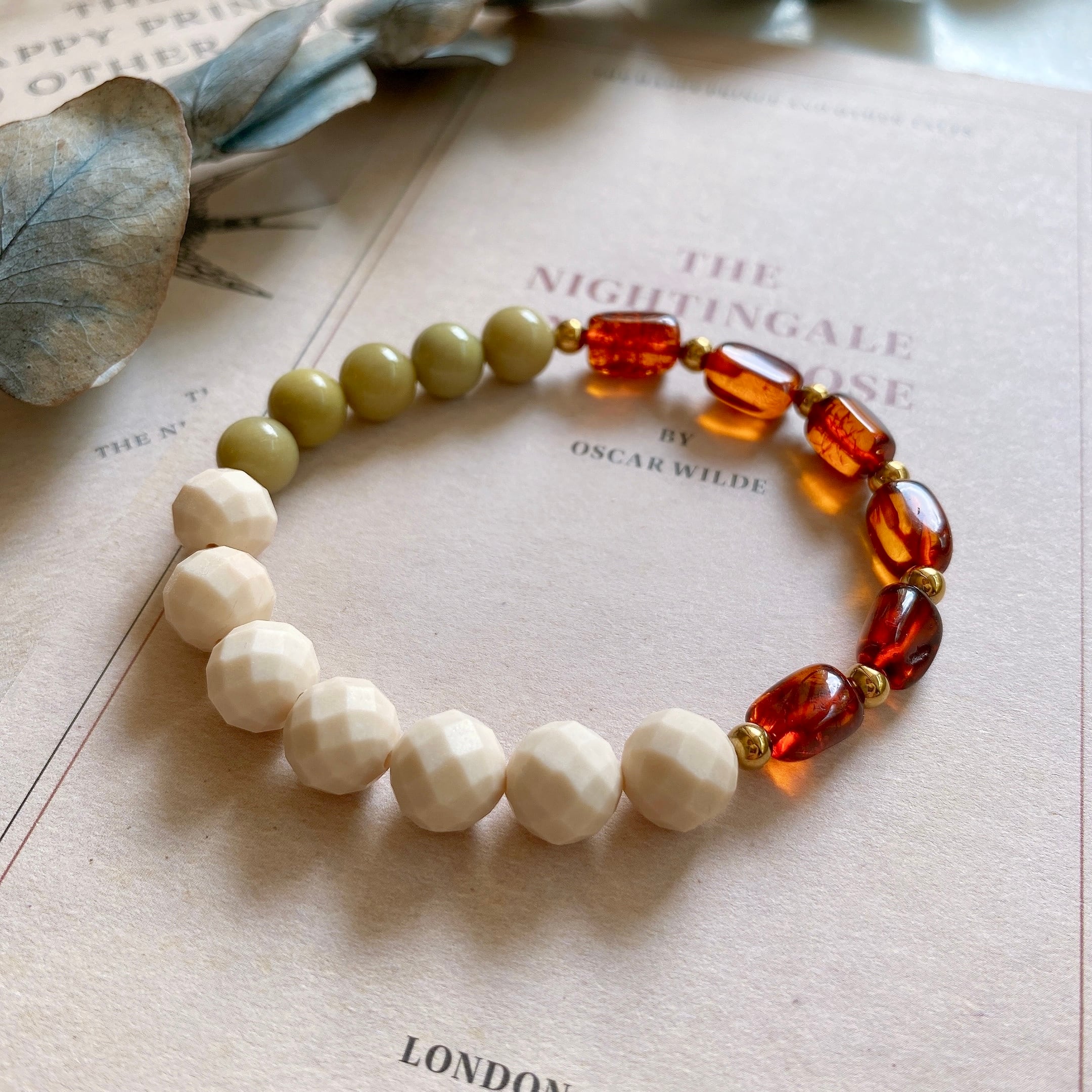 琥珀/金属アレルギー対応/アラシャンアゲート/天然石/くすみカラー/マーブル/淡水パール/パール/ゴールド/プレゼント/誕生日プレゼント/誕生日石/まる/花/チェコビーズ/アースカラー/モノトーン/差し色/ゴムブレス/パール/華奢