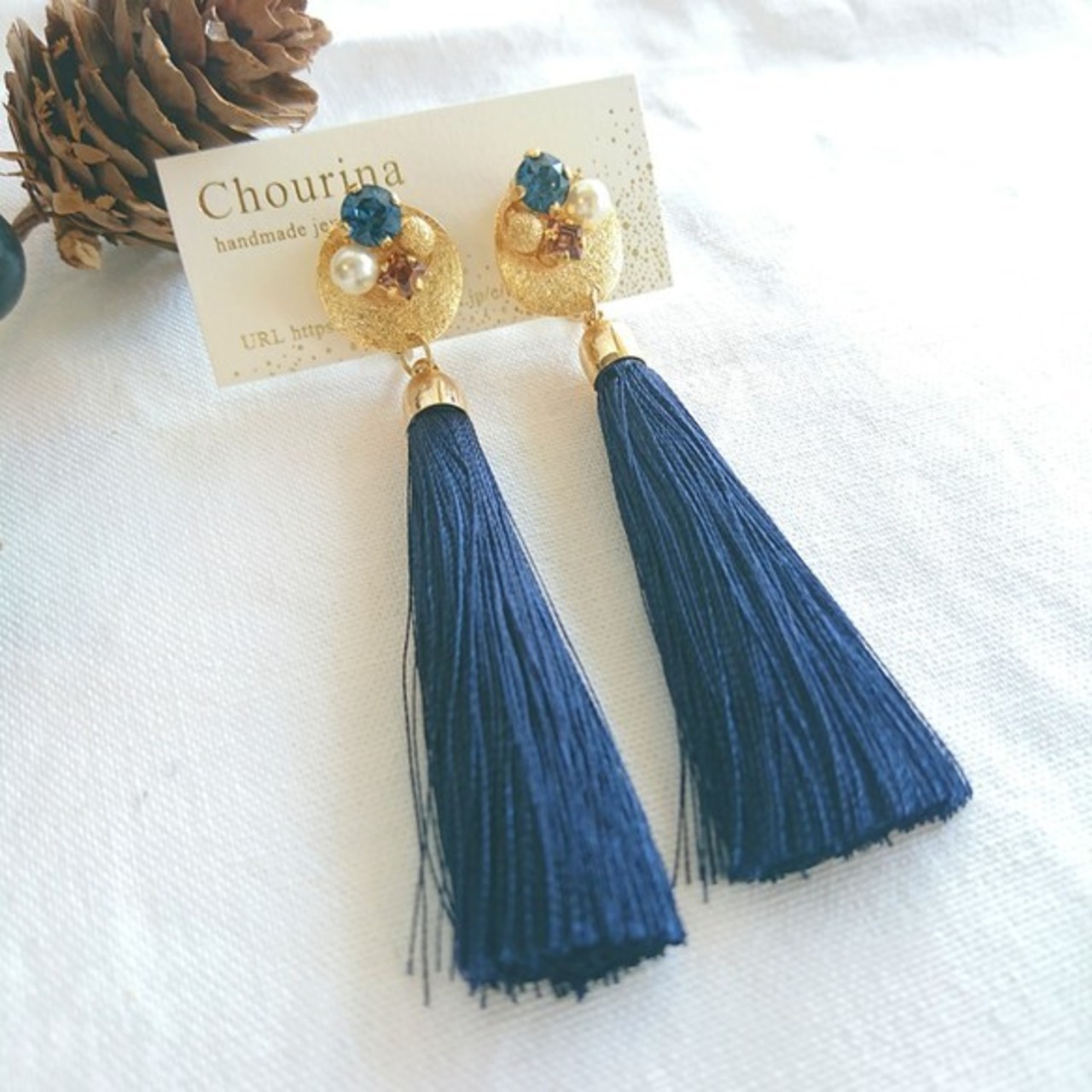 秋らしいネイビーのタッセルに合わせたのは、ネイビーとブラウンのスワロフスキー。