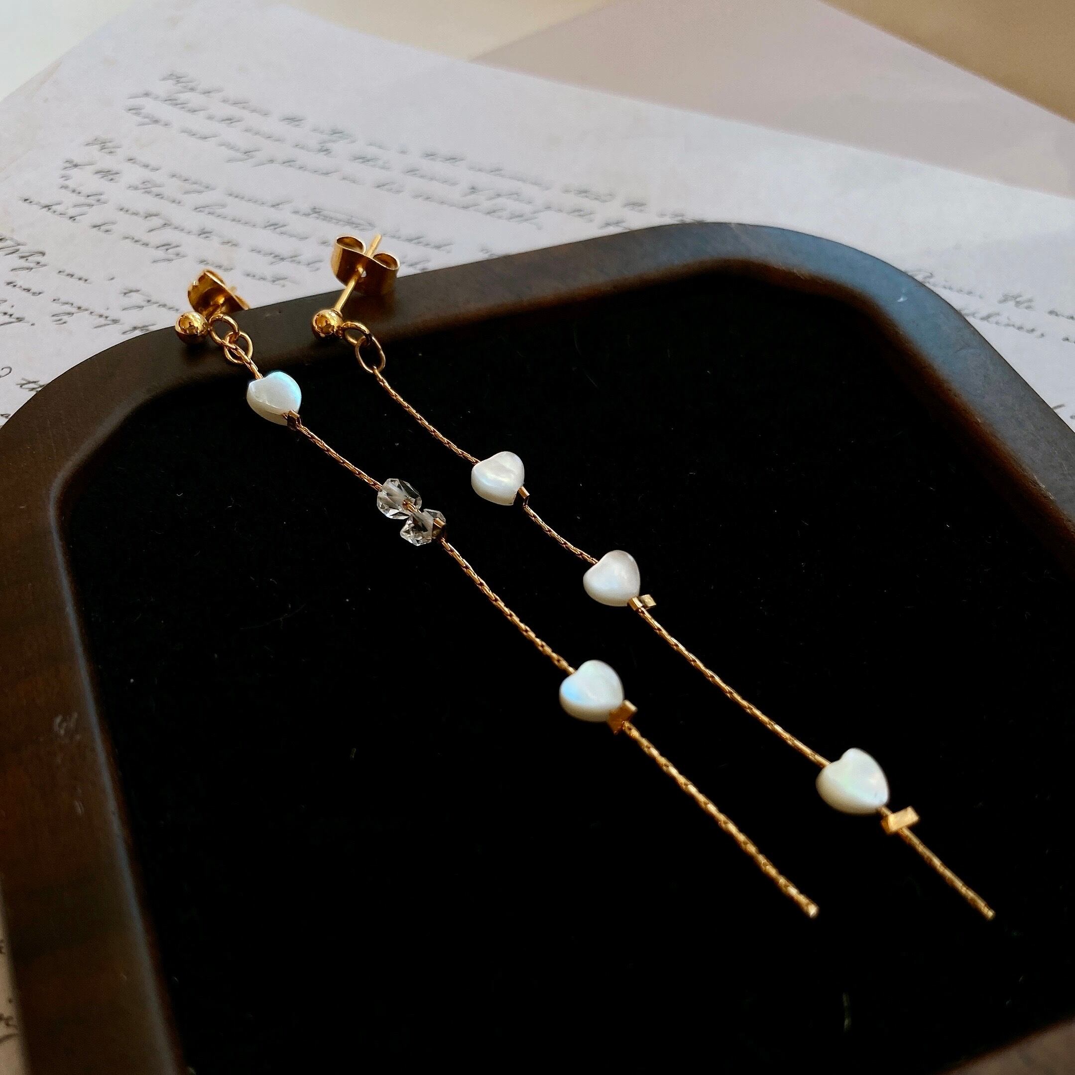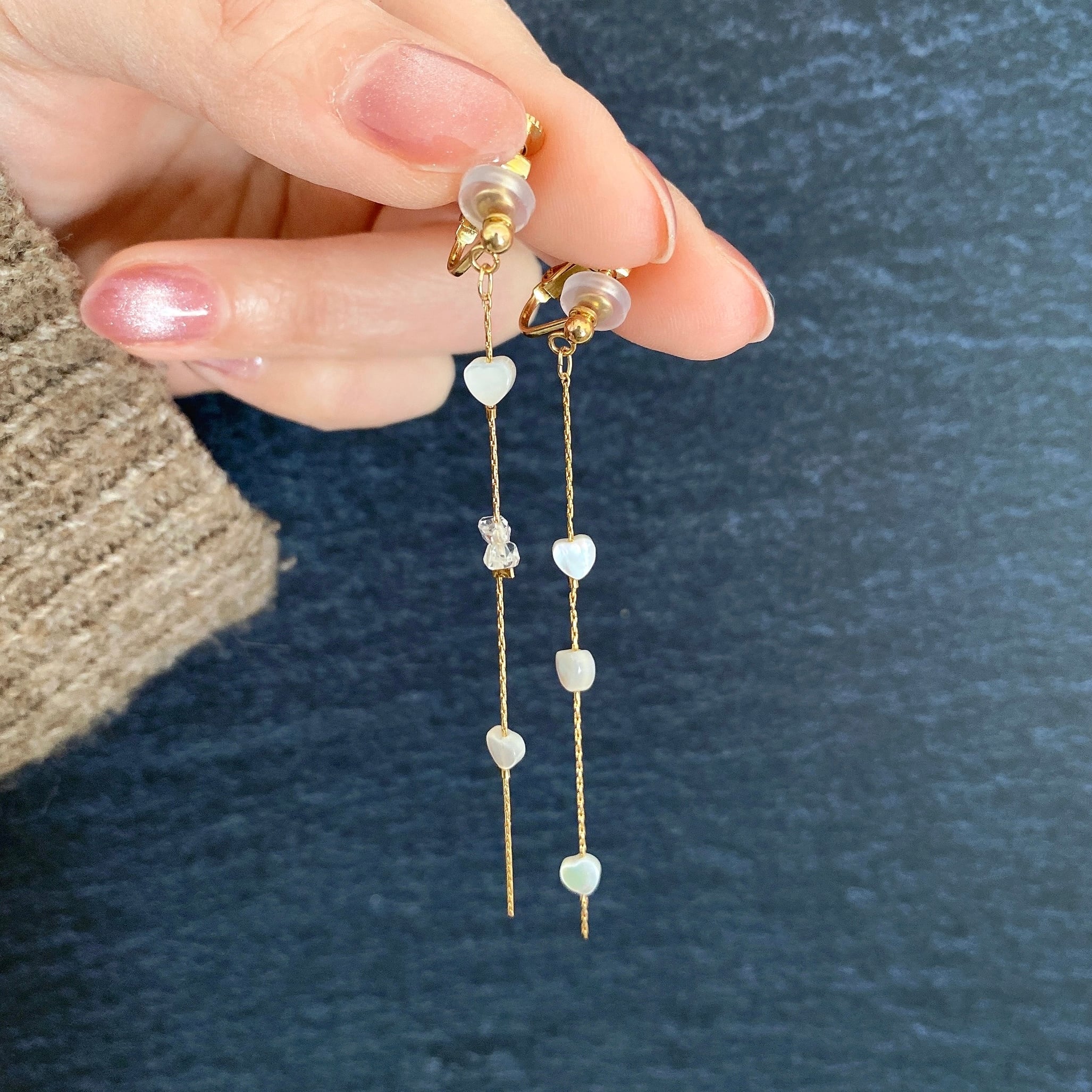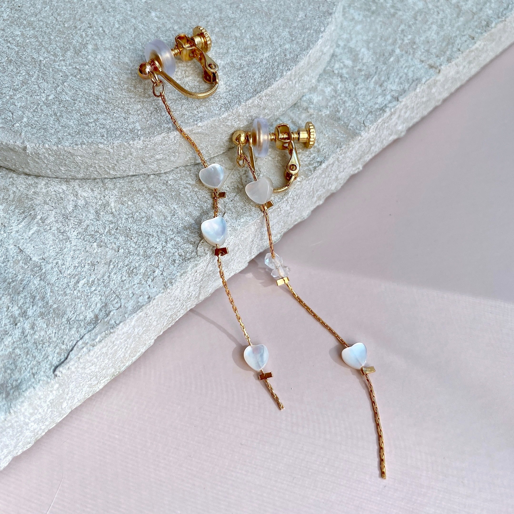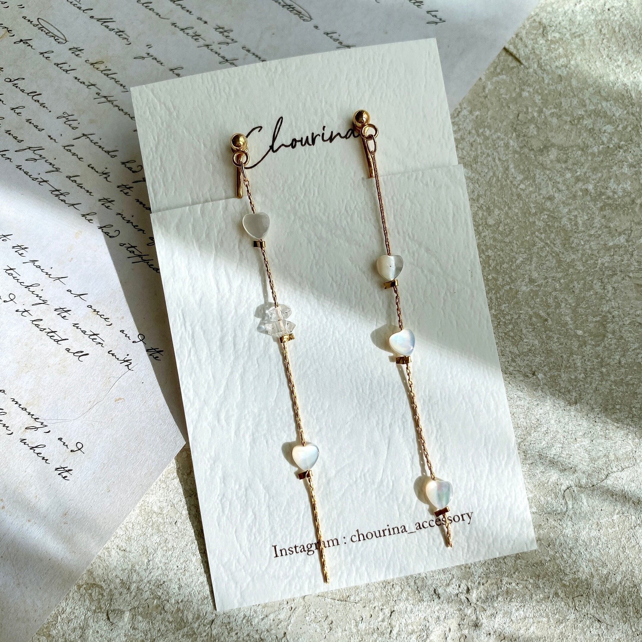 小さなハートのマザーオブパールとハーキマーダイヤモンドを組み合わせたアシンメトリーな耳飾り。