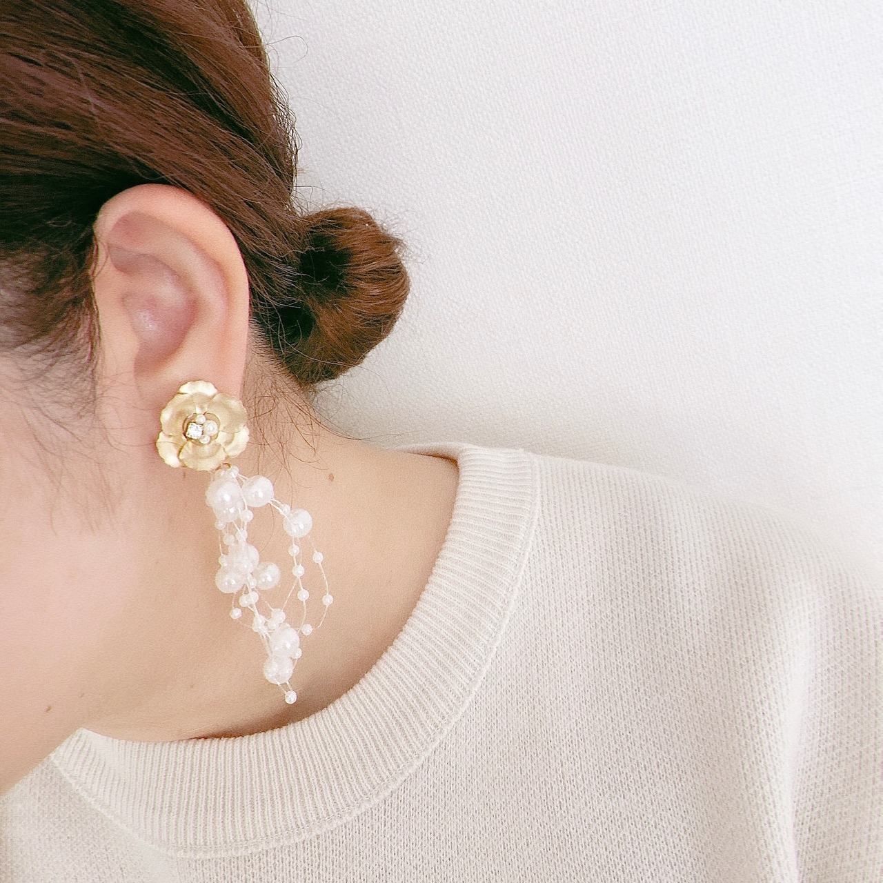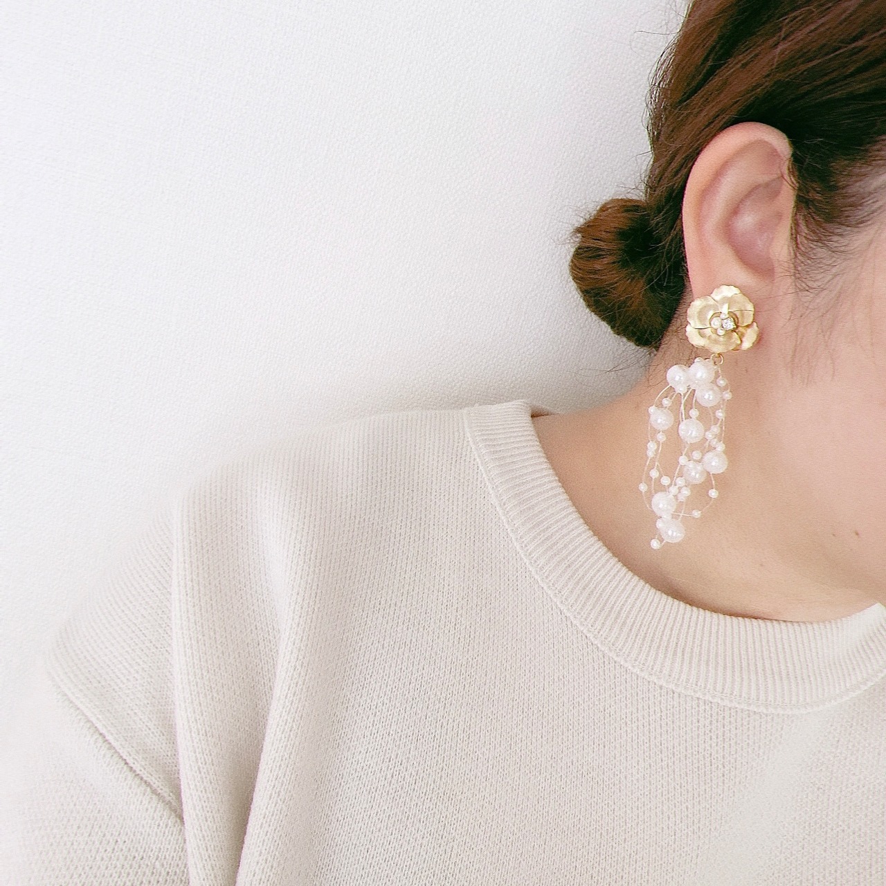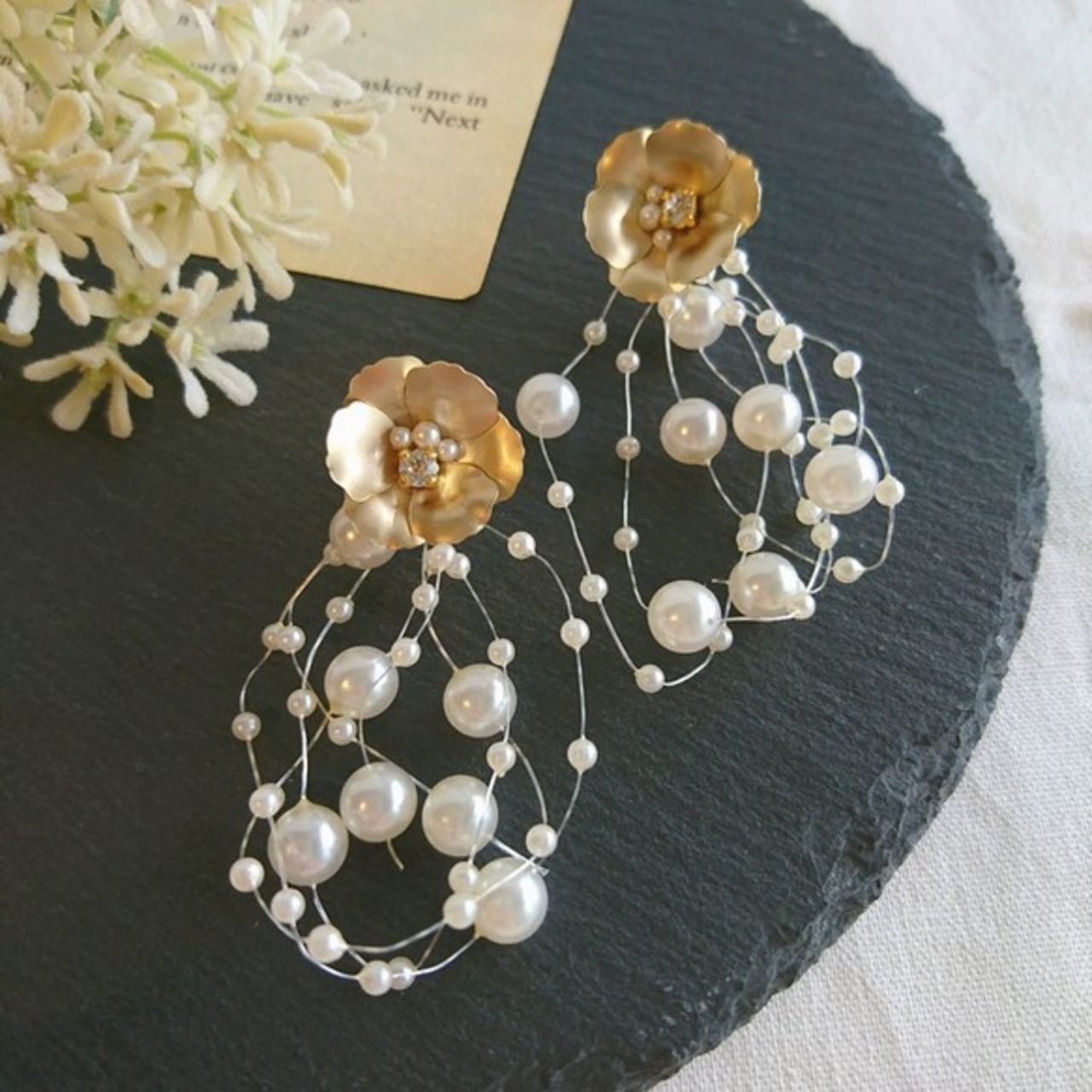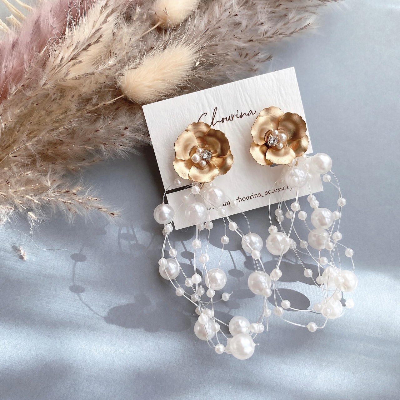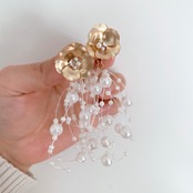ゴールドのお花とシャワーパールを合わせた華やかなイヤリング&ピアスです。