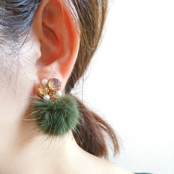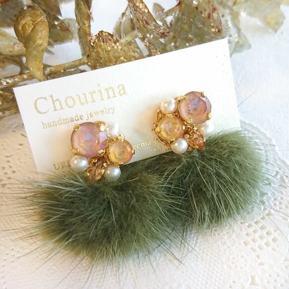 ふわふわのミンクファーと沢山のスワロフスキーを合わせた華やかで可愛らしいイヤリング&ピアスです。