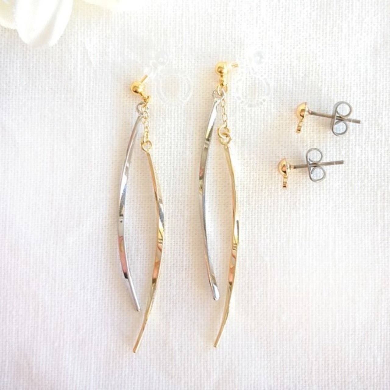 ゴールドとシルバーのスティックを合わせたスタイリッシュなノンホールピアス(イヤリング)です。