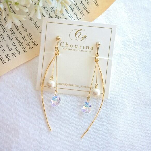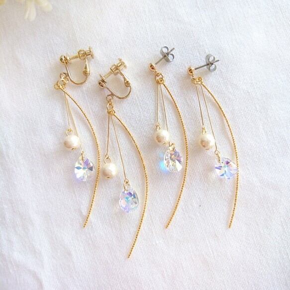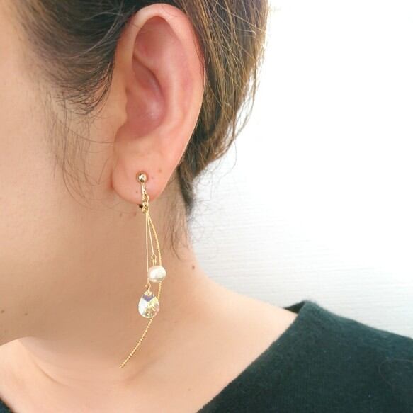 雫形のスワロフスキーと細身の曲線スティックを合わせた華奢なイヤリング/ピアスです。