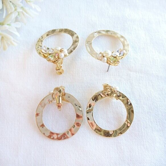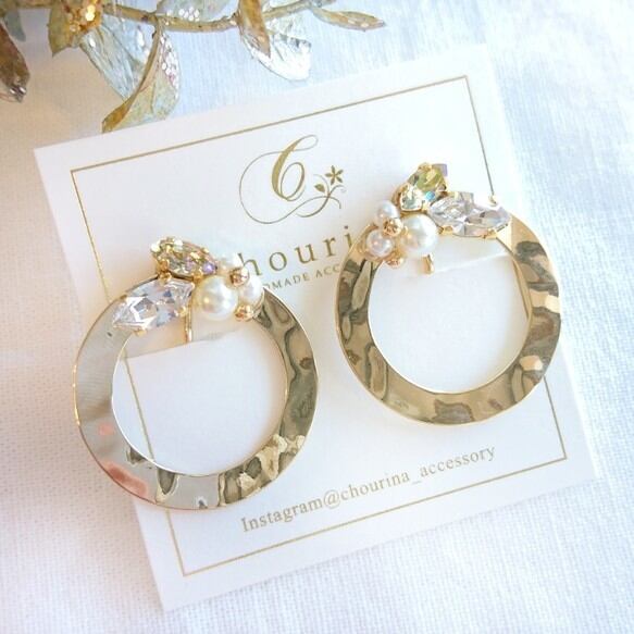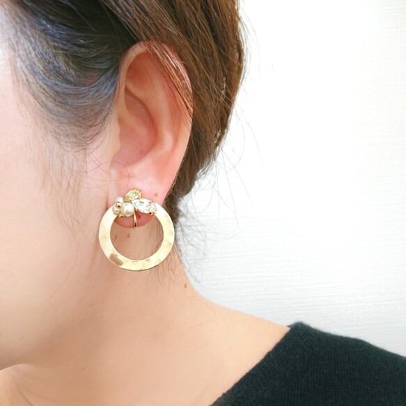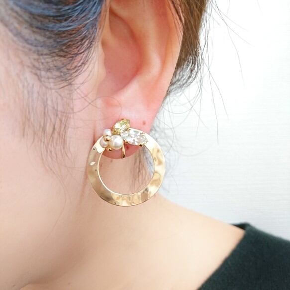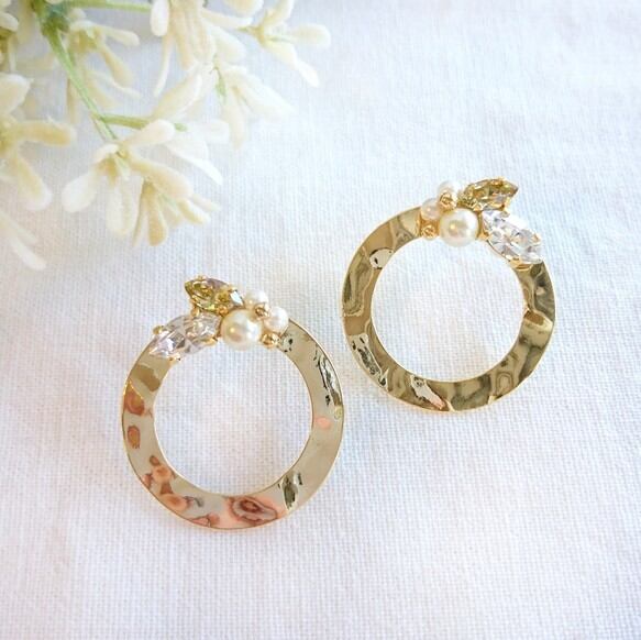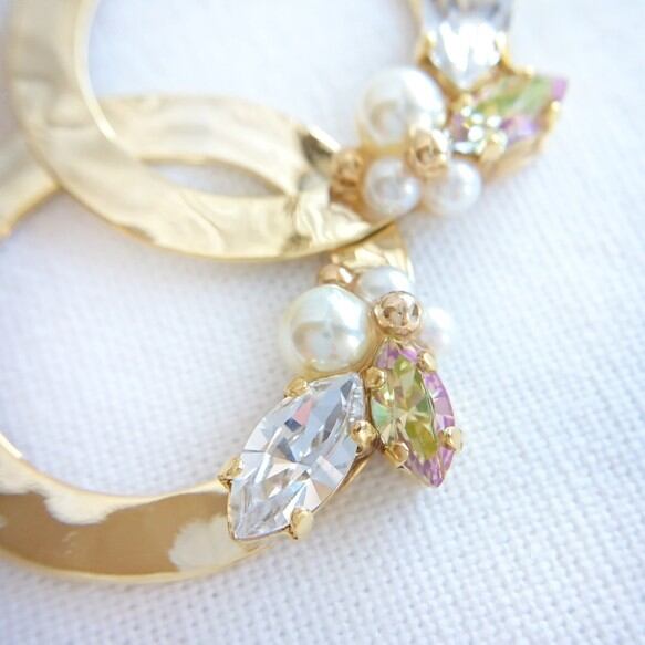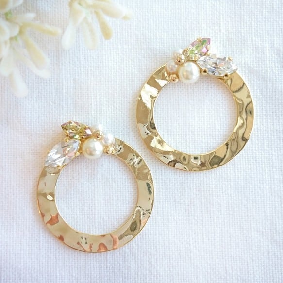 ゴールドのリングにスワロフスキーやパールを飾ったイヤリング/ピアスです。