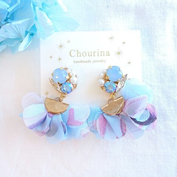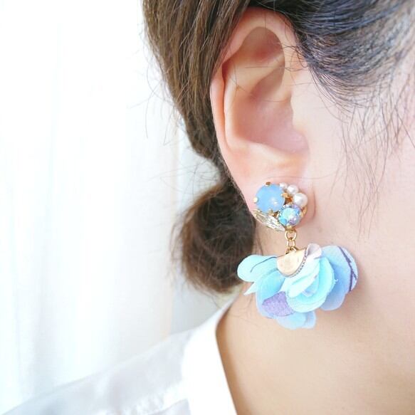 【数量限定】シフォンフラワーとビジューイヤリング/ピアス(ライトブルー)/ハンドメイド