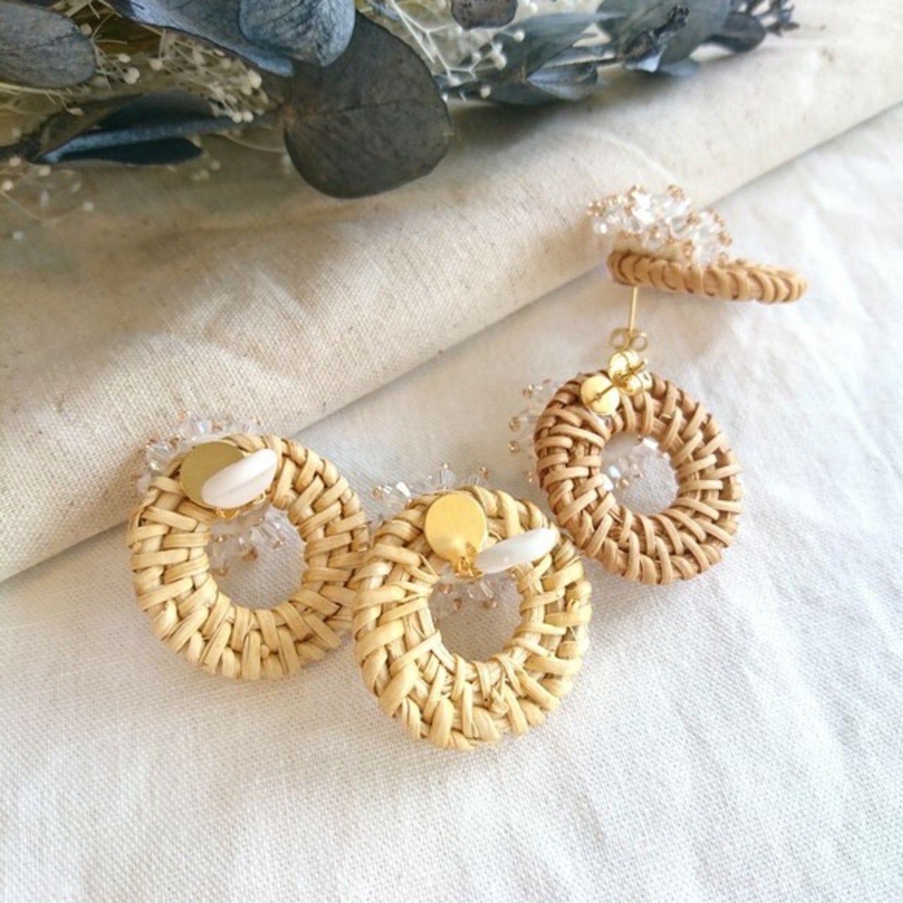 夏らしいラタンとビーズカボションを合わせたイヤリング/ピアスです。