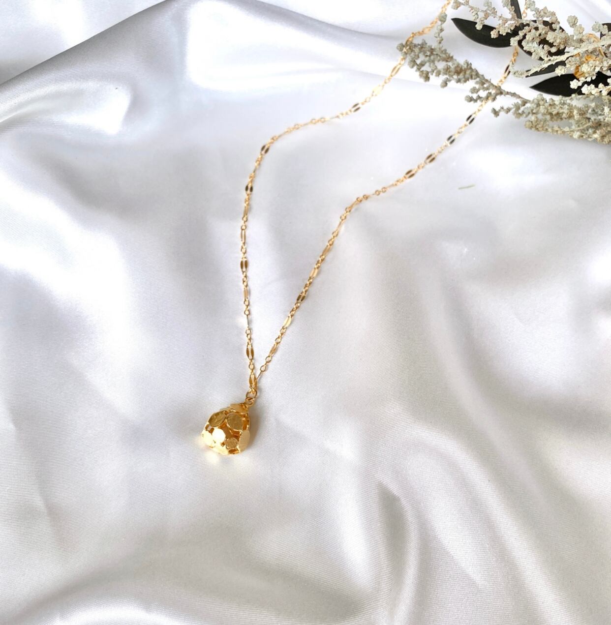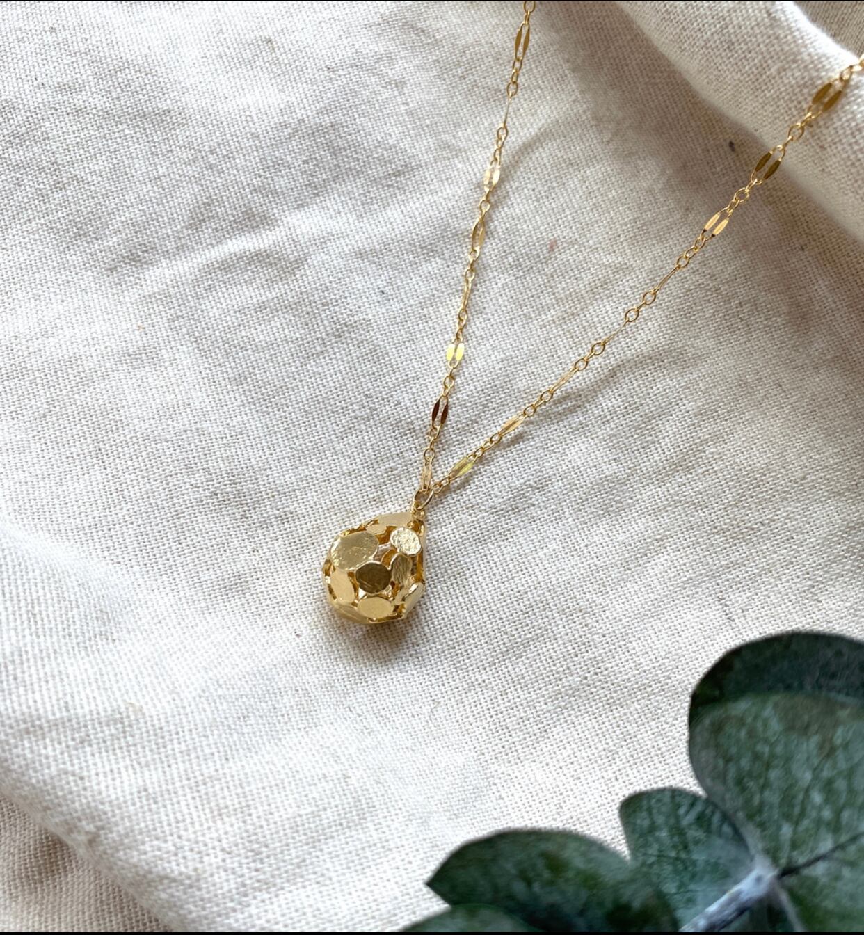 14kgfのデザインチェーンとドット柄のドロップを合わせたロングネックレスです。
