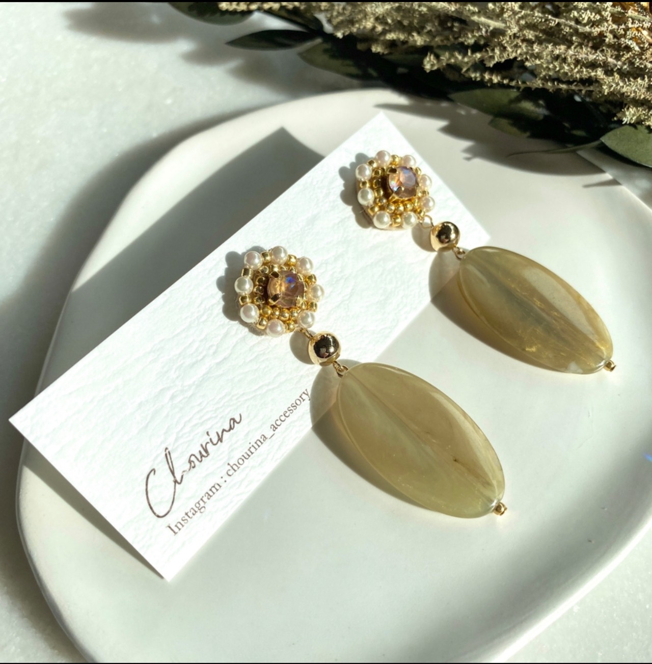 ゴールドビーズと小粒のパールで囲うように縫っているので、お花のような可憐さと華やかさがあります。