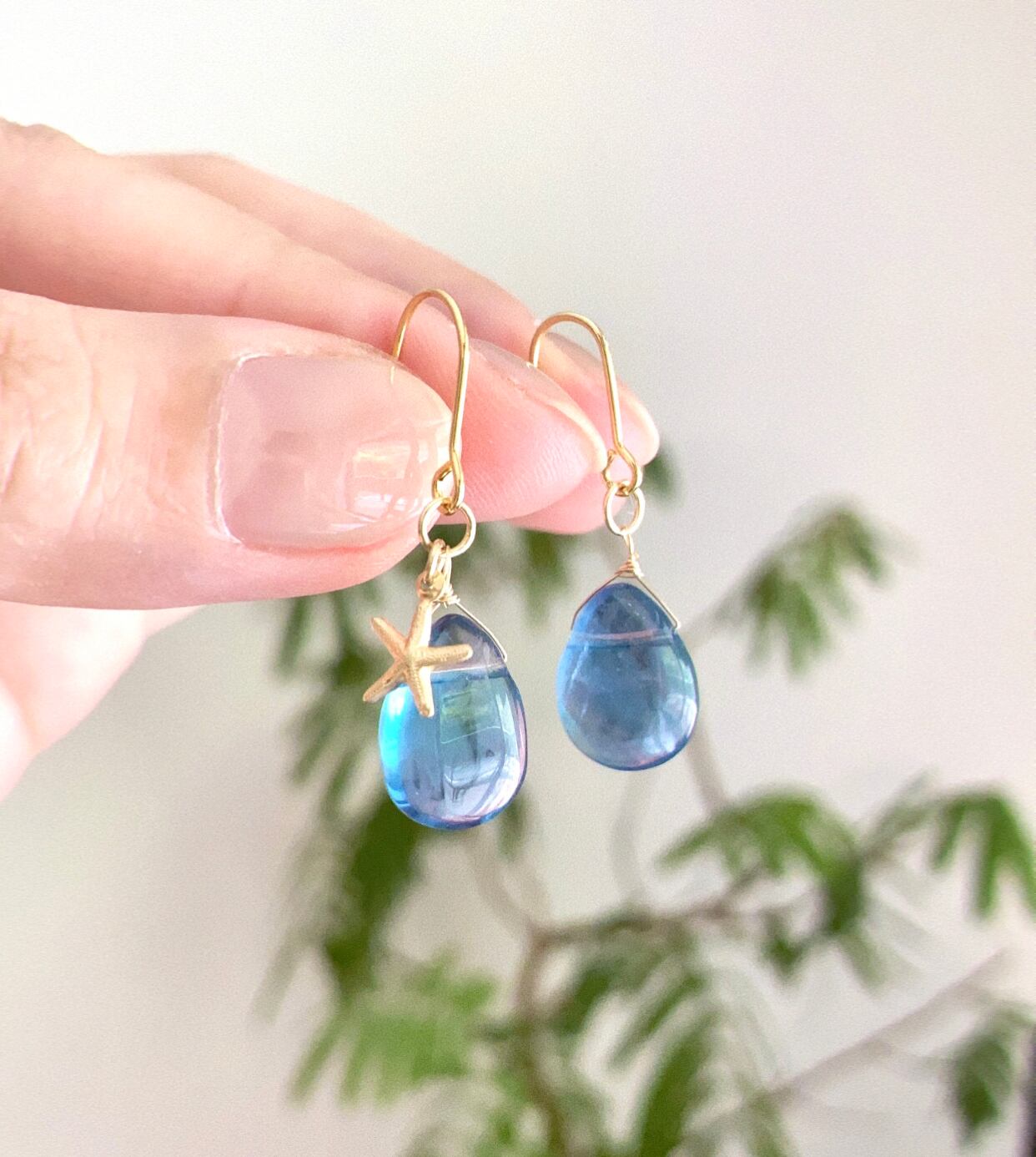 片方に14kgf製のスターフィッシュ(ヒトデ)のチャームを飾って、アシンメトリーなデザインに。