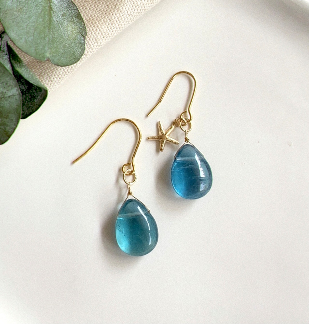 海を想わせる美しいブルーフローライトが主役のピアスです。