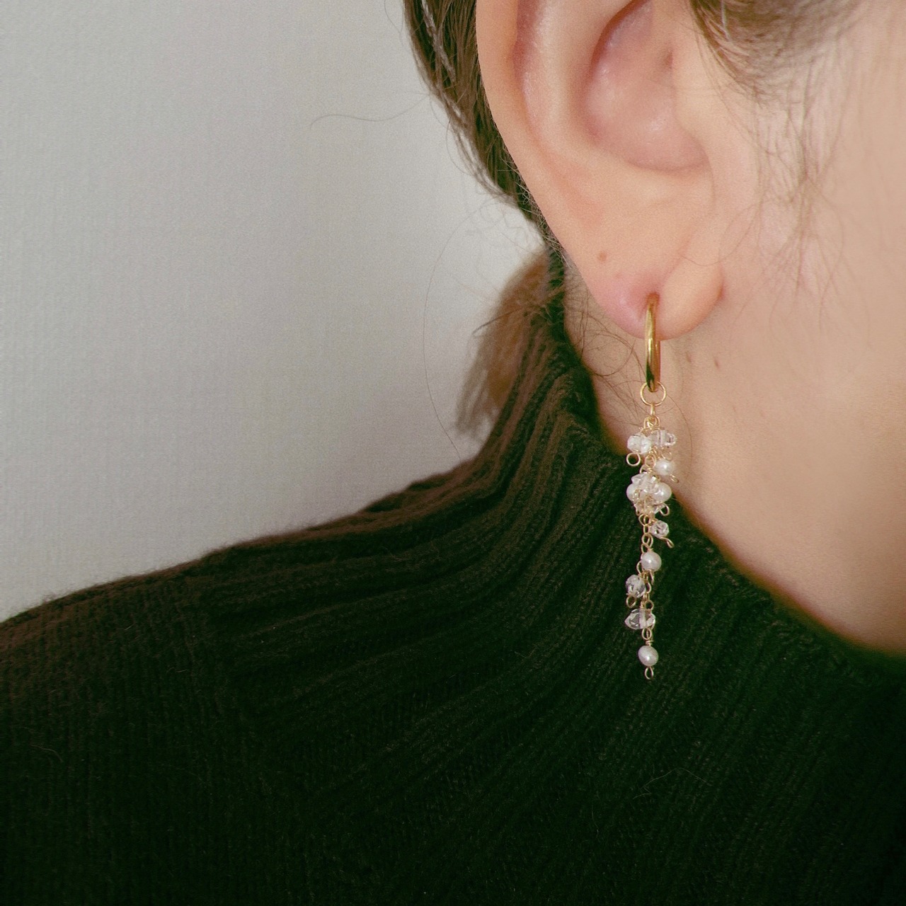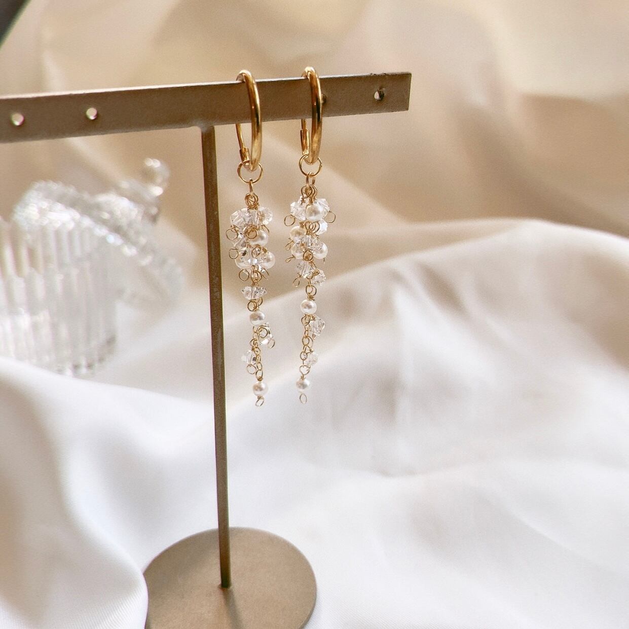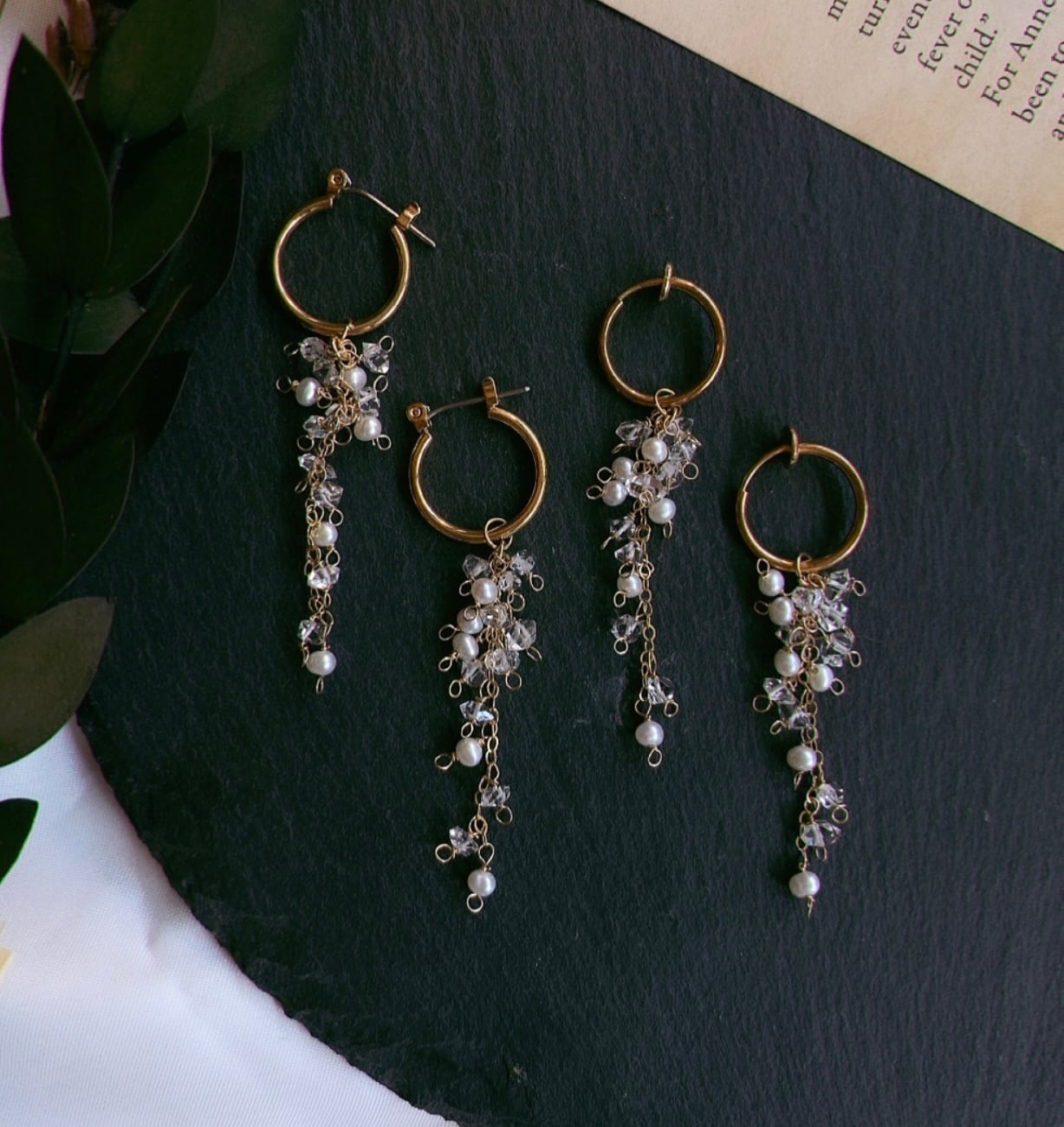 ハーキマーダイヤモンドと淡水パール、両耳で合計30石使用。