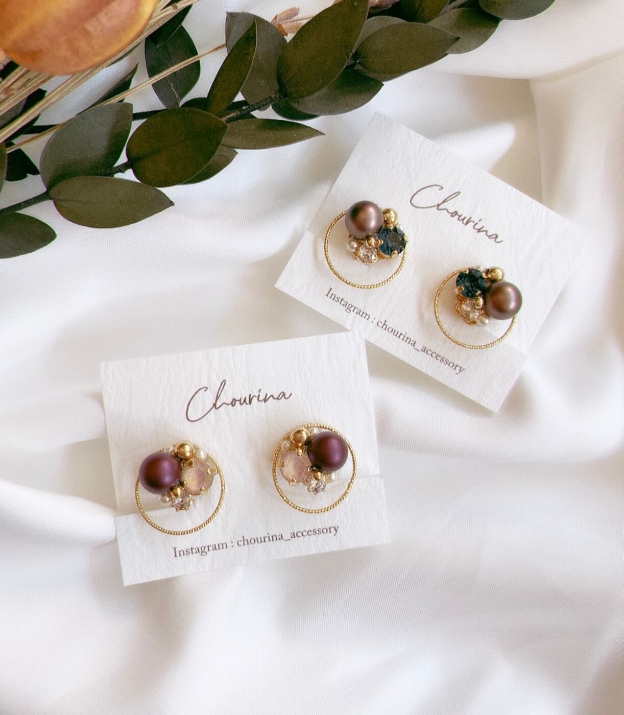 秋冬らしいシックな色合いのクリスタルとパールを合わせたデザインです。