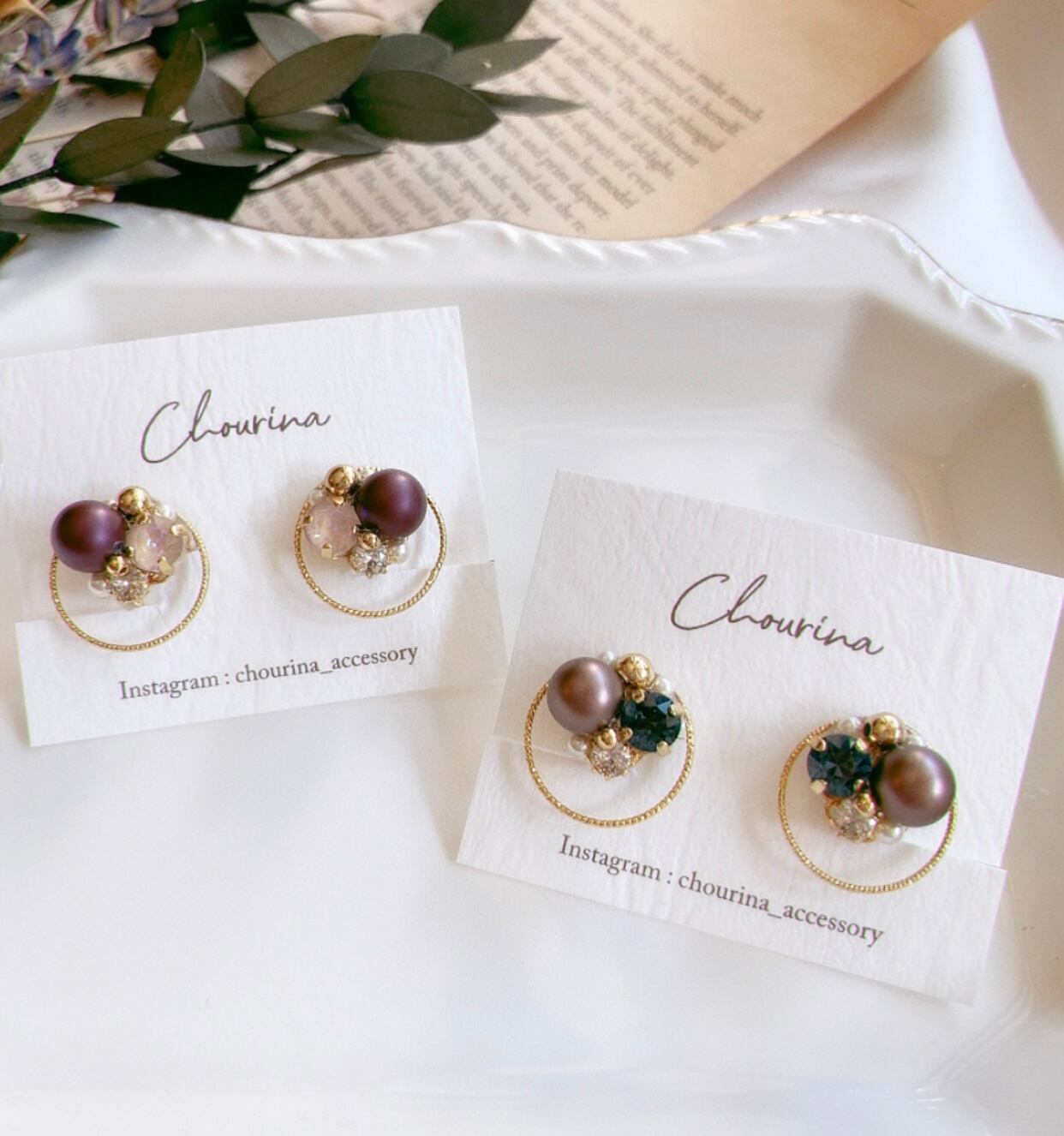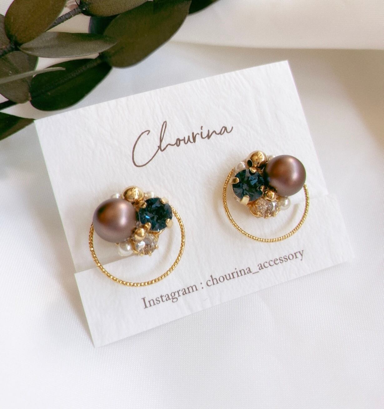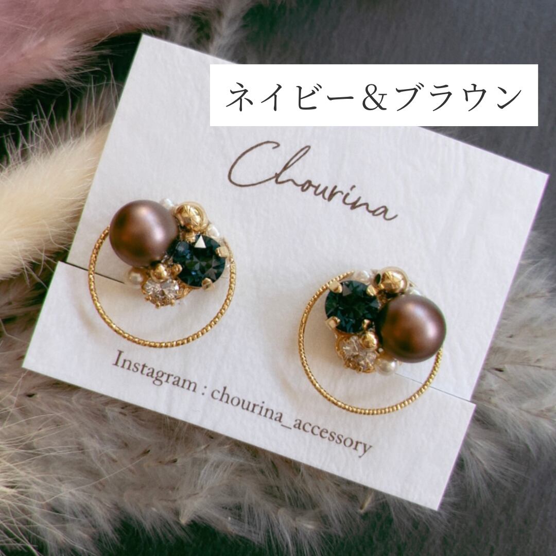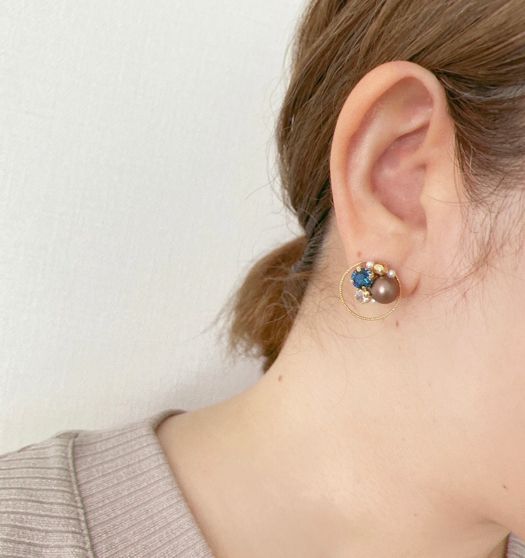 煌めきのあるネイビークリスタル、艶のあるブラウンパールが華やかでエッジのある印象です。