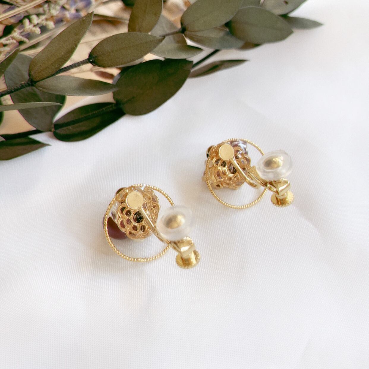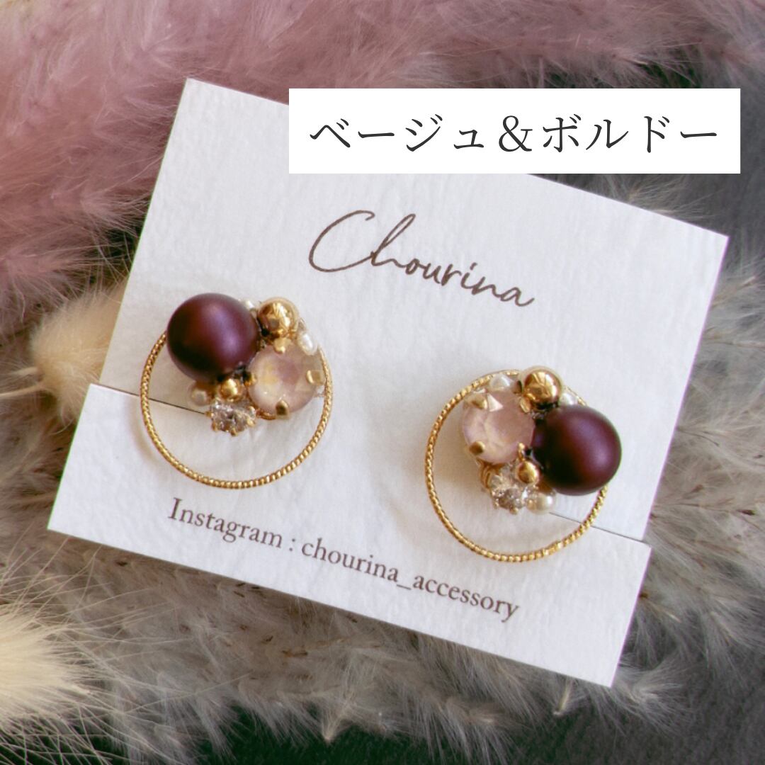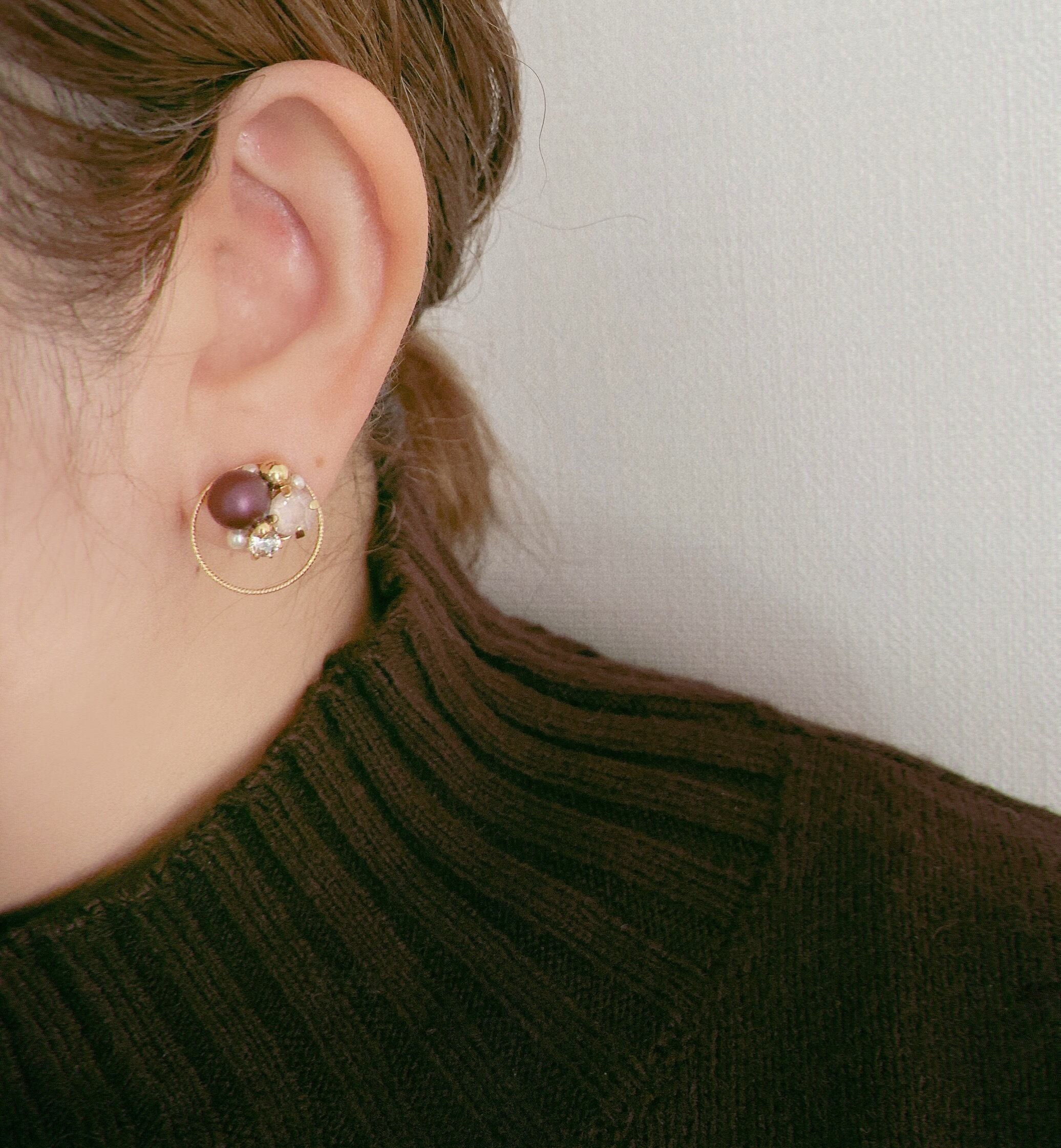 マットなベージュのクリスタルとセミマットのボルドーパールを合わせたので、全体的にふんわりと優しい印象です。