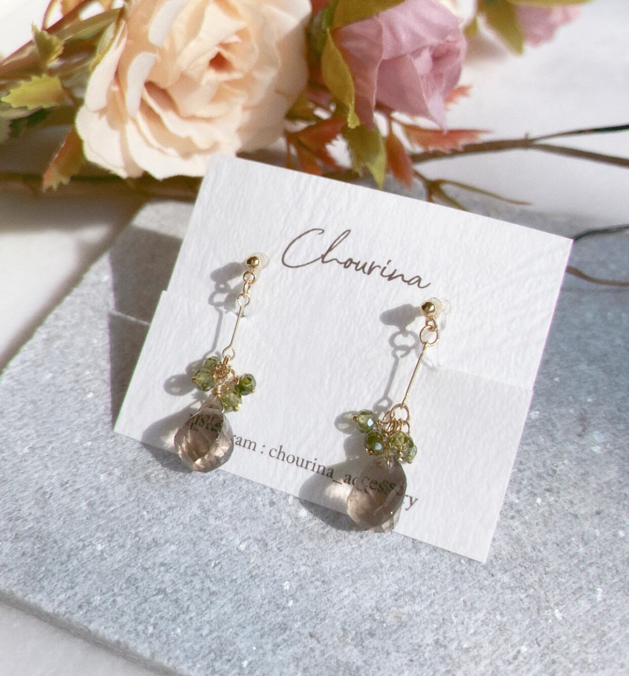ブラウンとグレーの中間のようなスモーキークォーツと淡いグリーンのジルコニア。