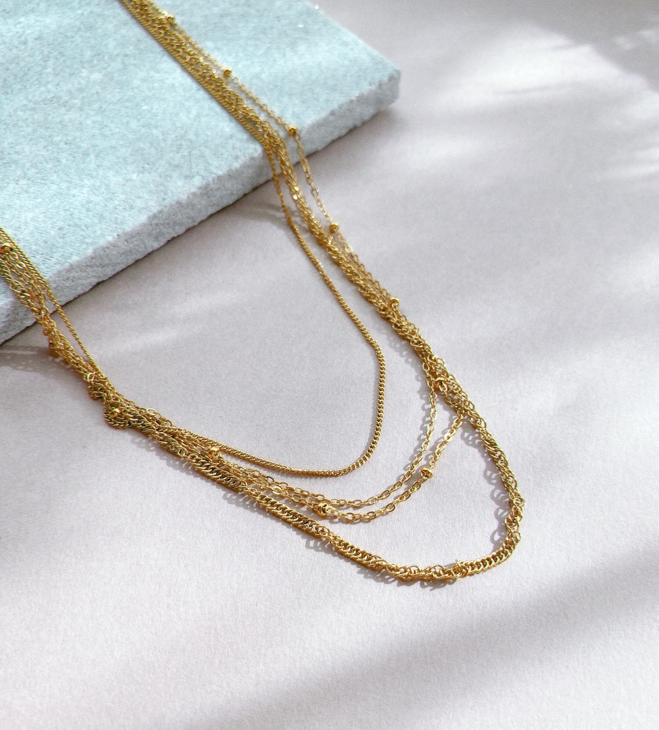 クセのないシンプルなチェーンやドット付きチェーン、スクリューチェーンなど4種類をミックスしたデザインです。