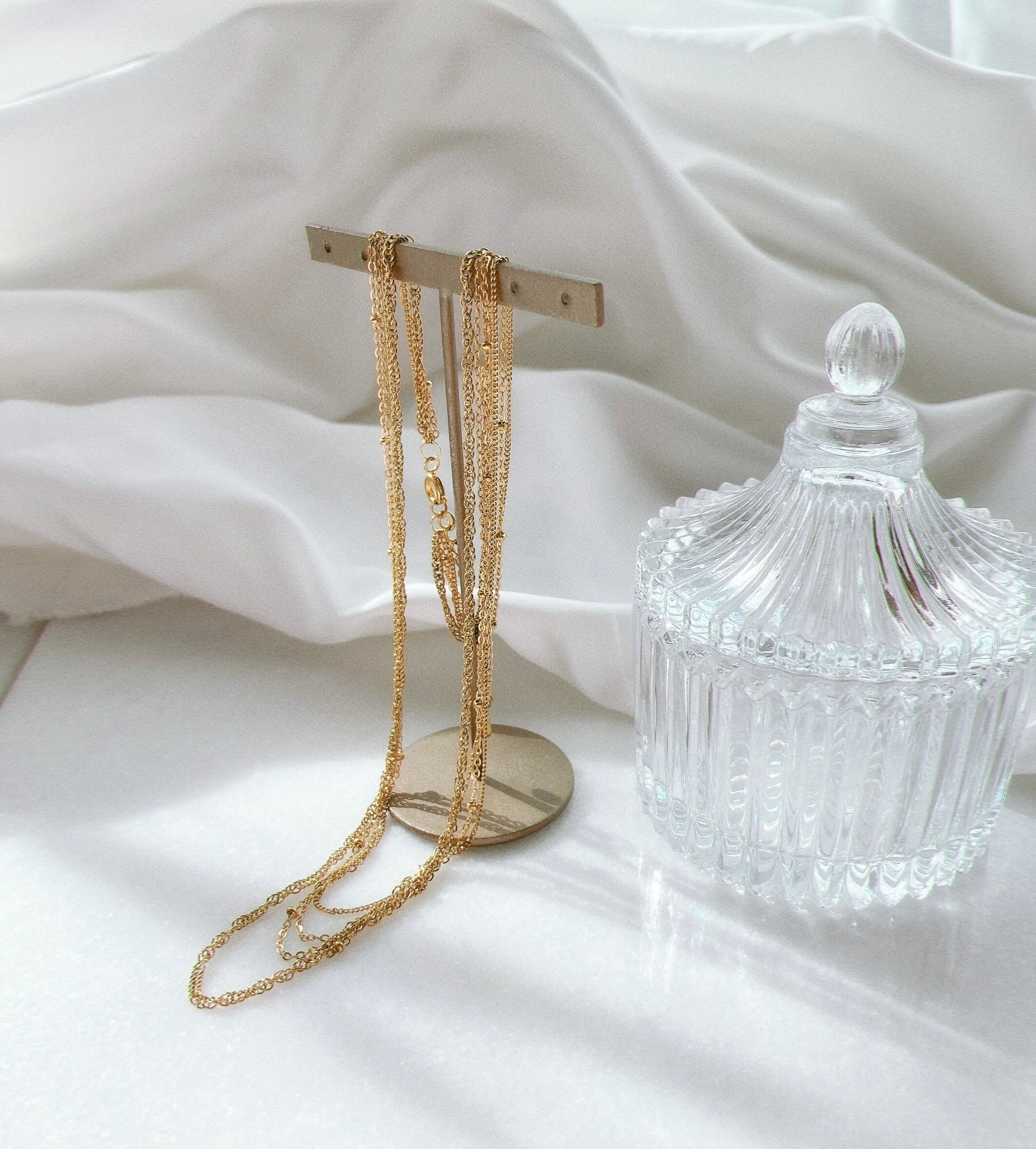 華奢なチェーンも組み合わせる事で、華やかな存在感と奥行きをプラスしてくれます。