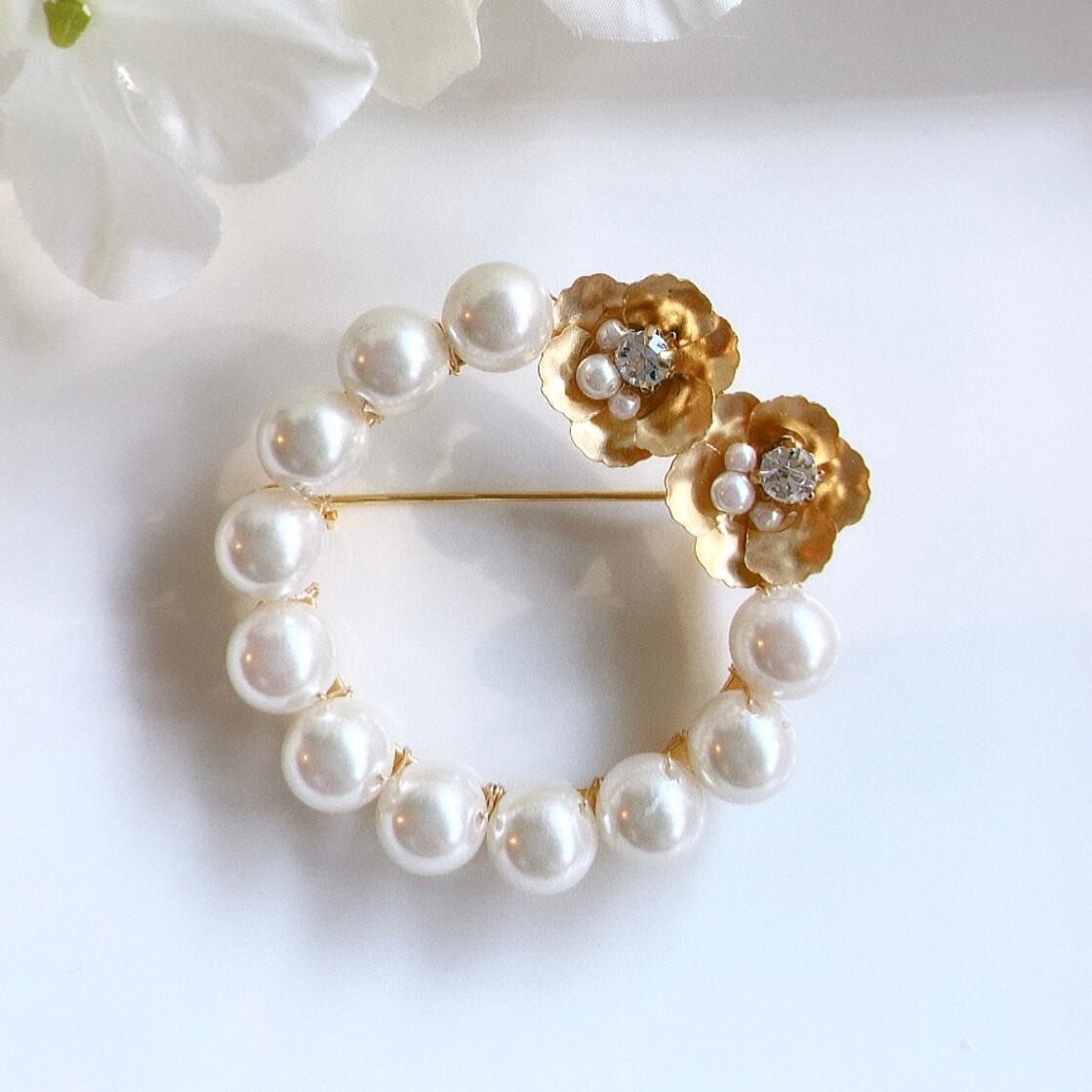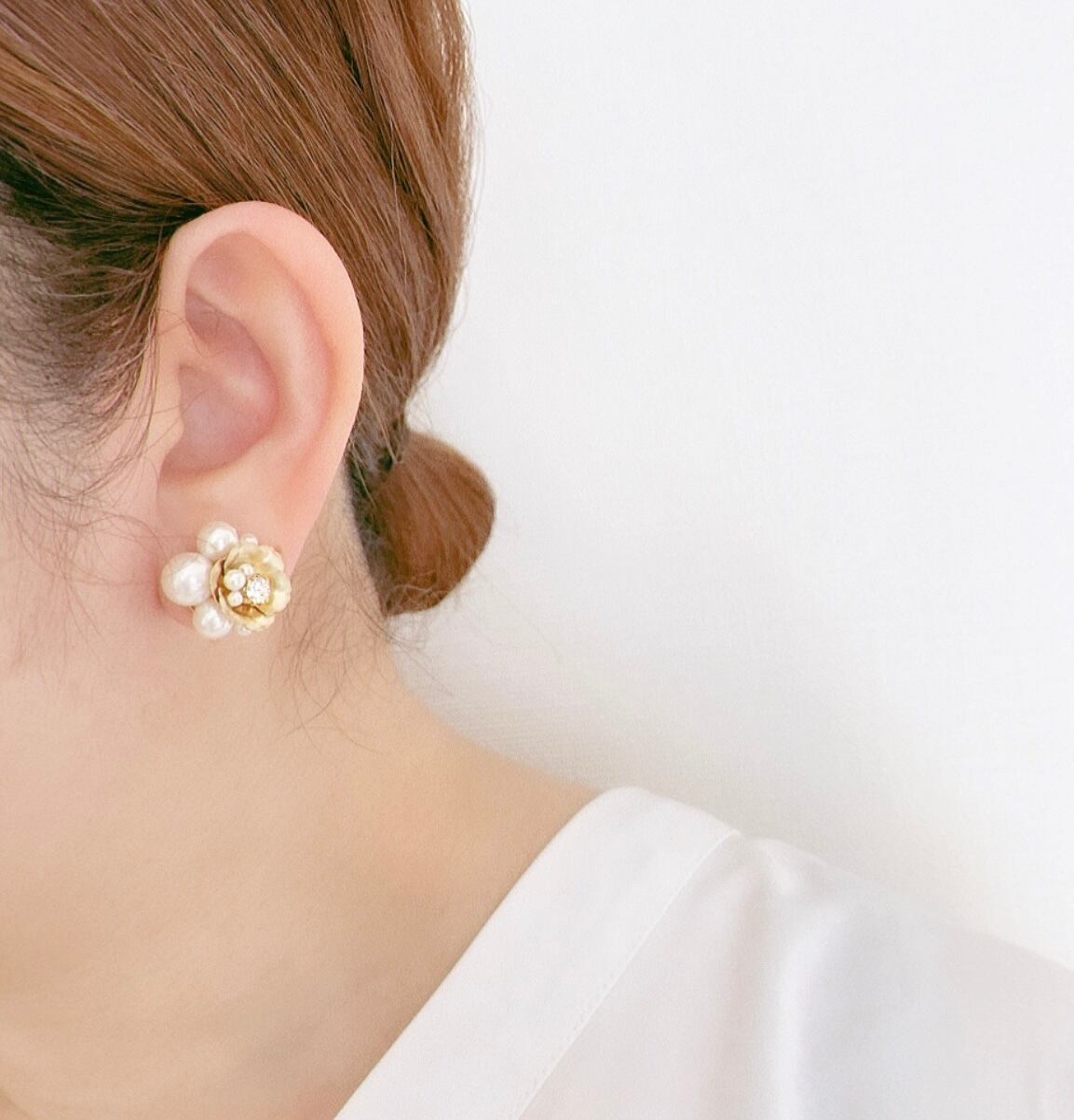お花は優しく輝くマットゴールドなので、ツヤのあるパールとのコントラストが美しいです。