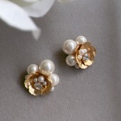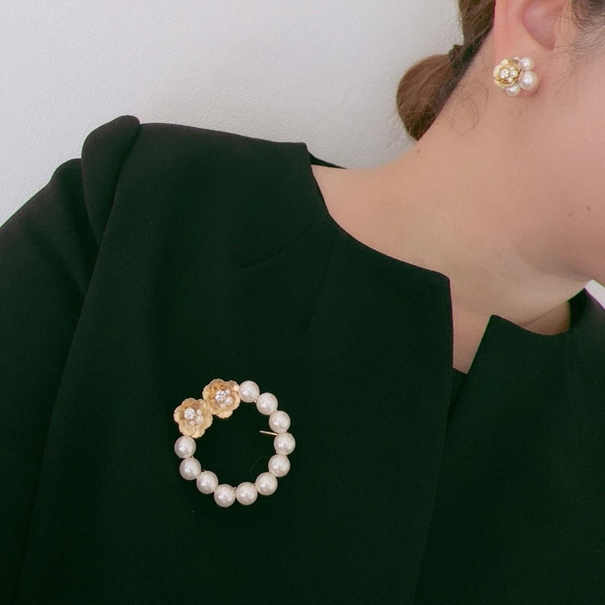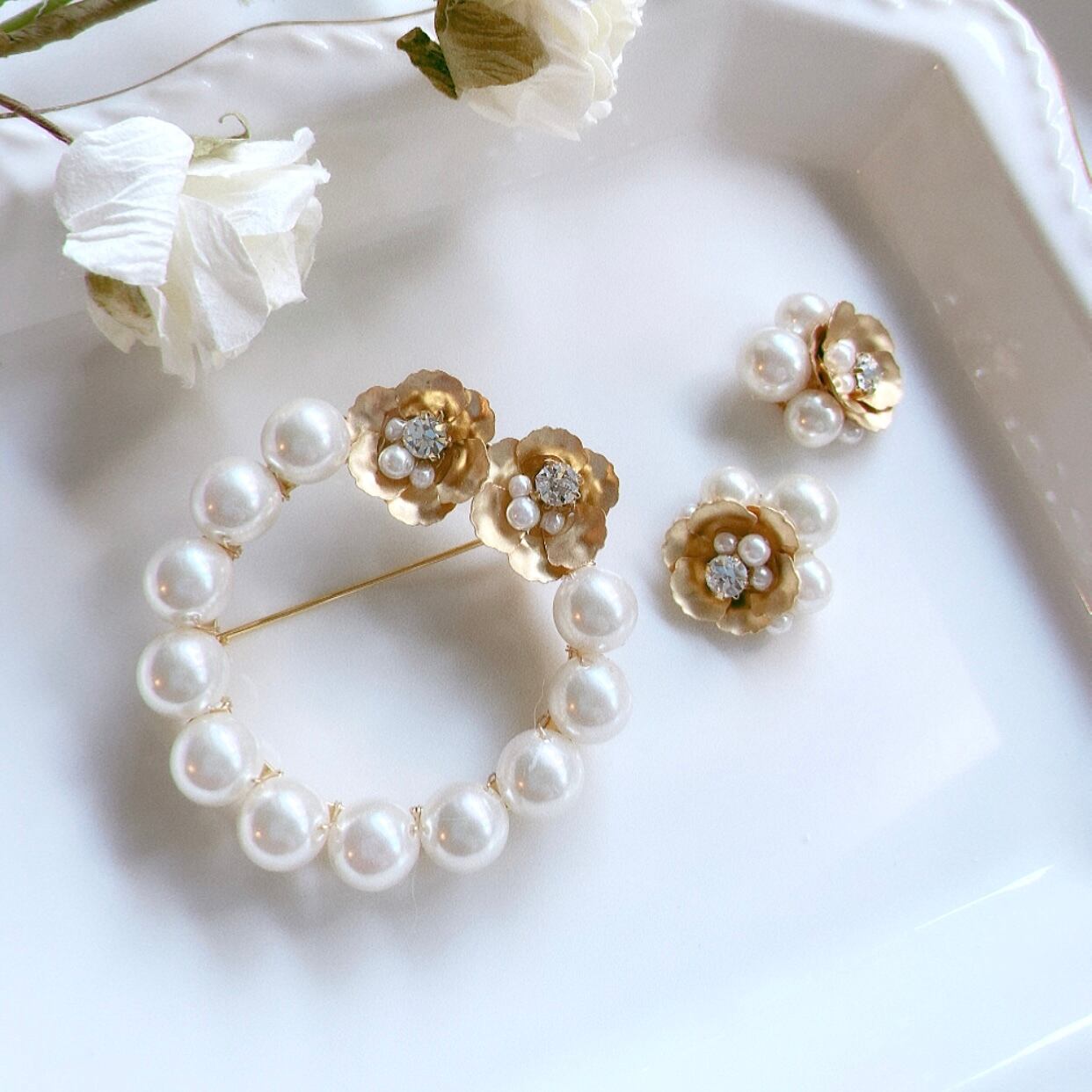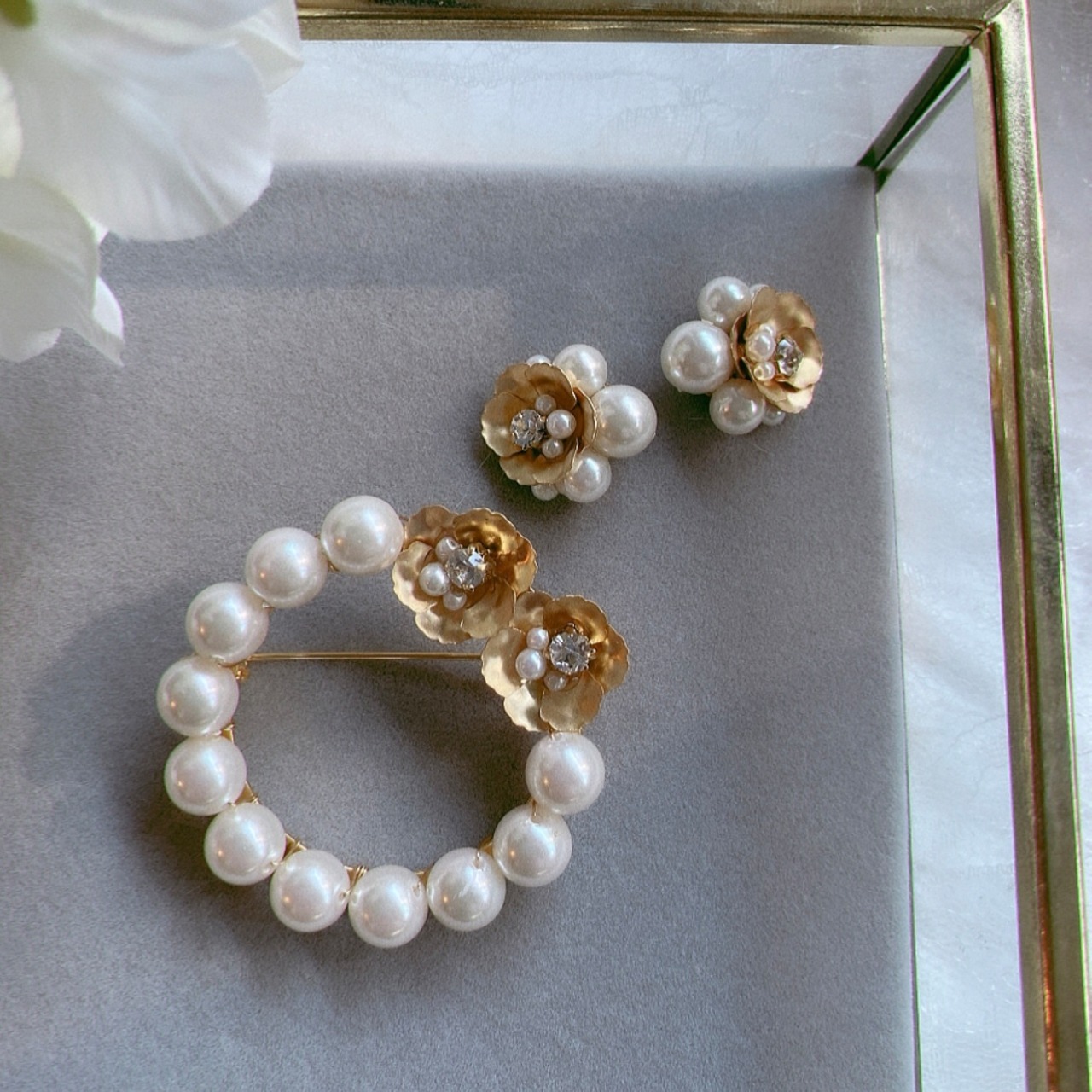 パールとマットゴールドのお花を合わせたブローチと耳飾りのお得なセットです。