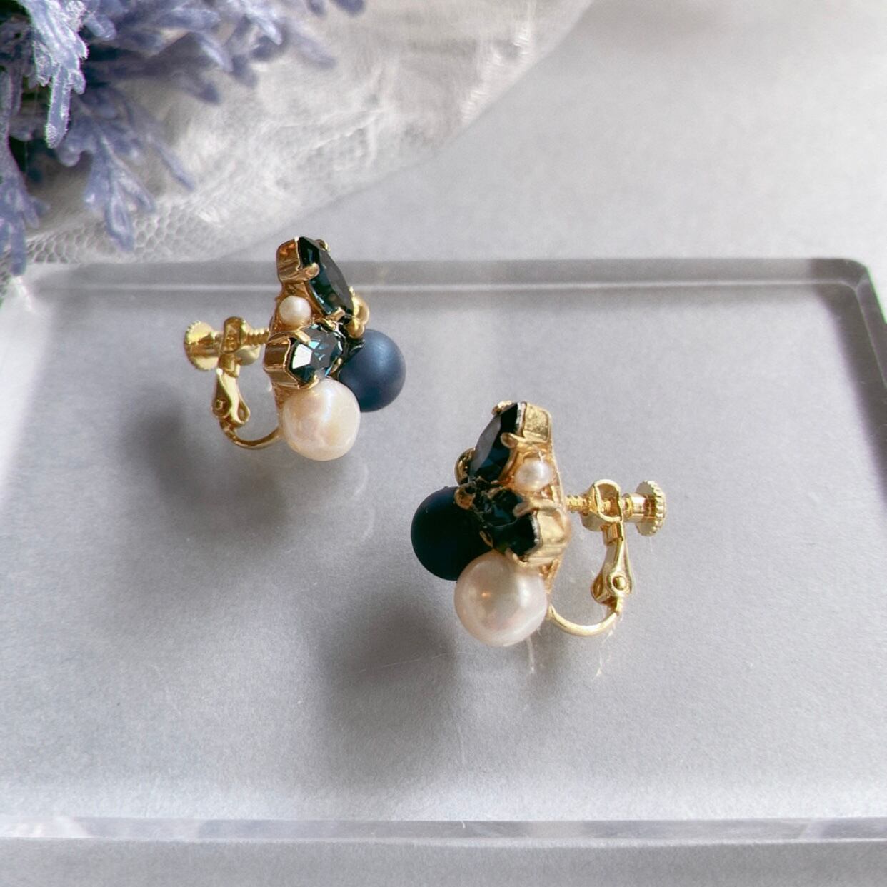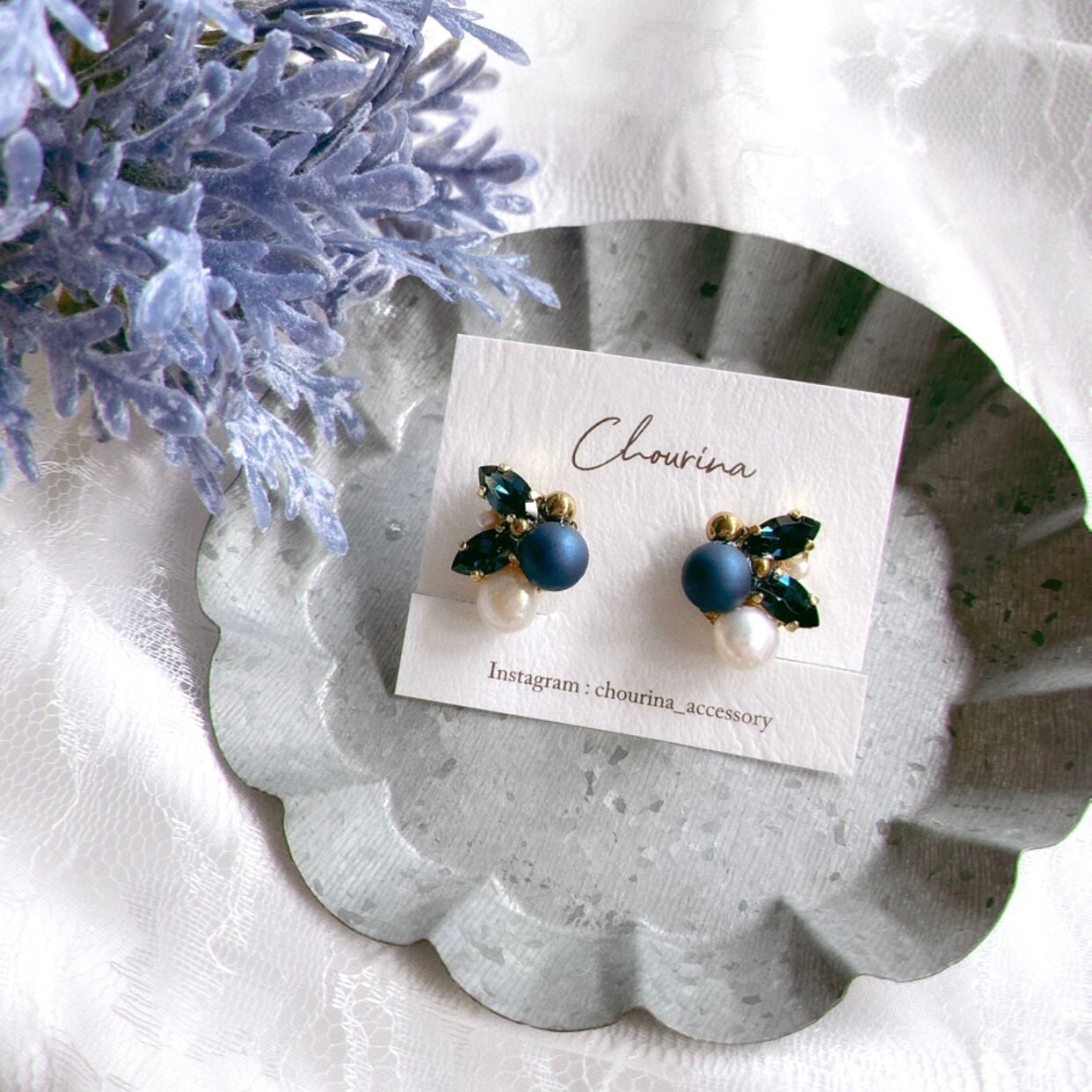ネイビーカラーのビジューと淡水パールを合わせたイヤリング/ピアスです。