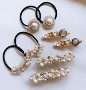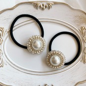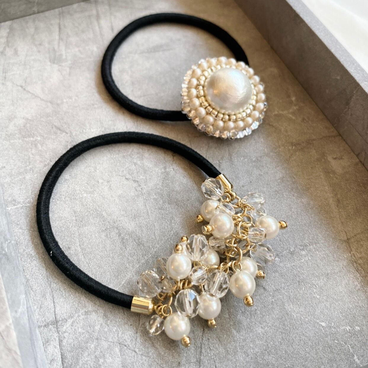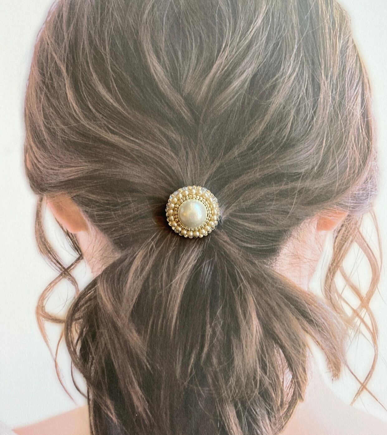 ホワイトのコットンパールを中心にパールやビーズで刺繍を施したヘアゴムです。