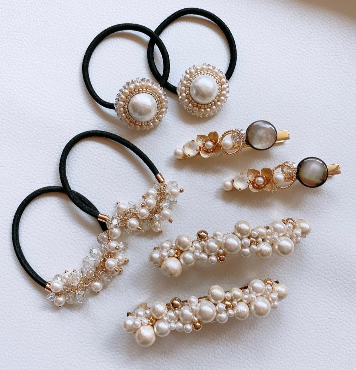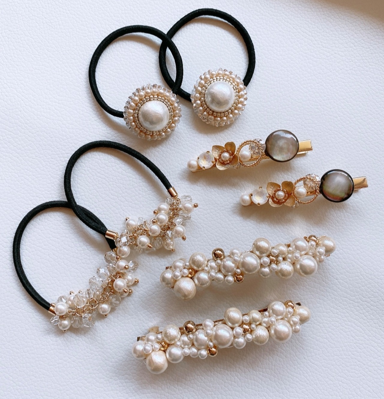 中央のコットンパールから、シャンパンカラーのビーズ、マットな小粒パール、そして周りを囲うようにクリアカラーのビーズを合わせました!