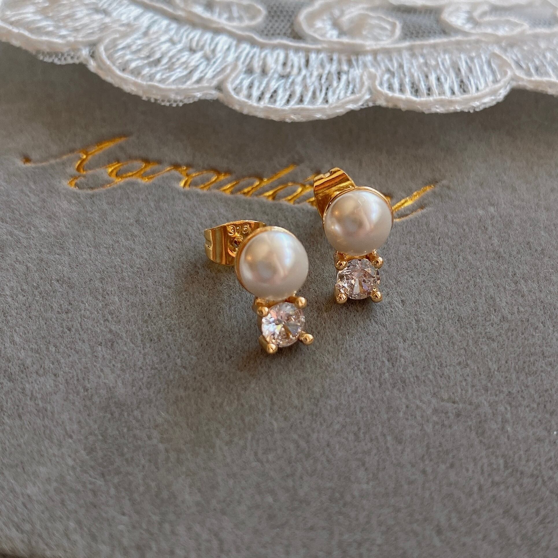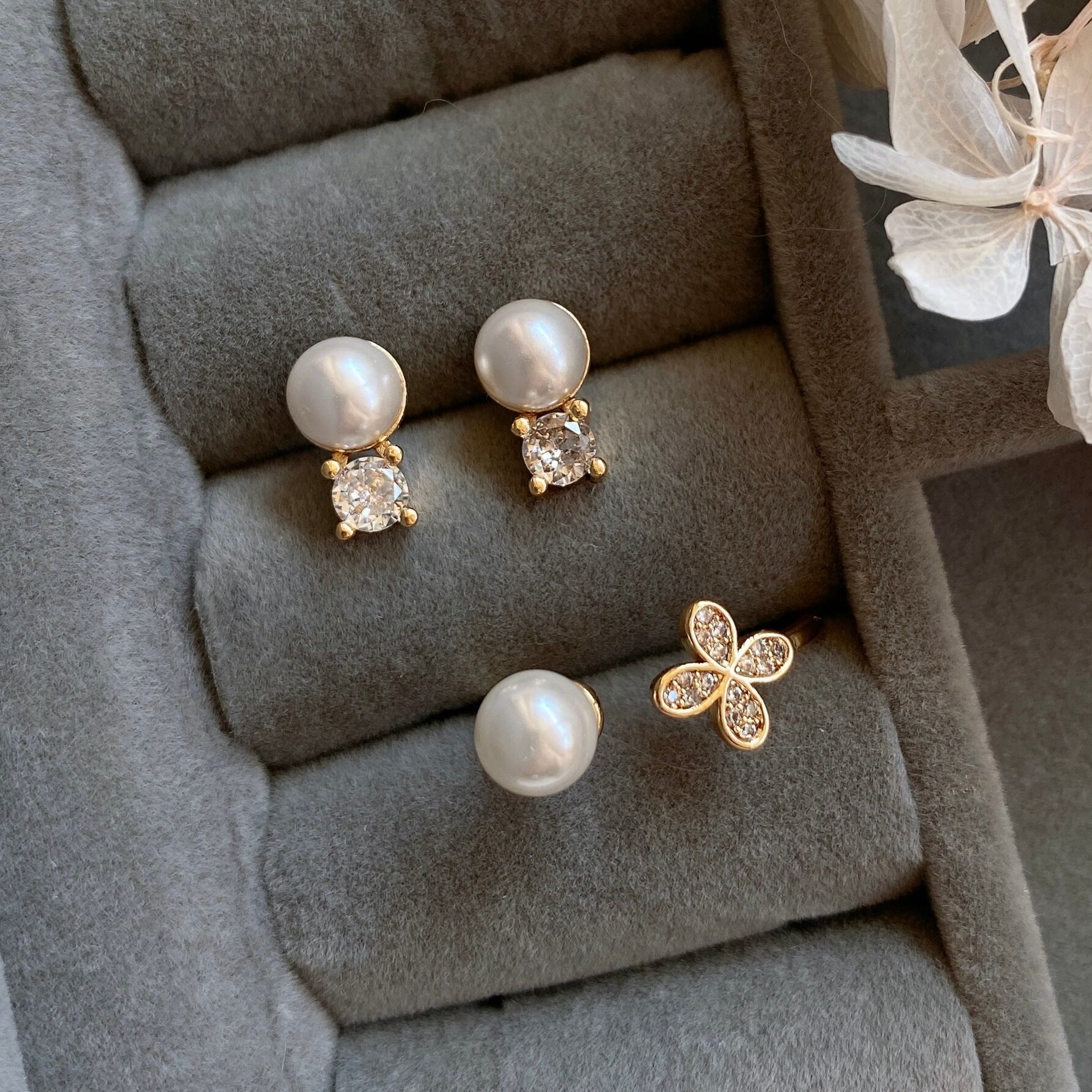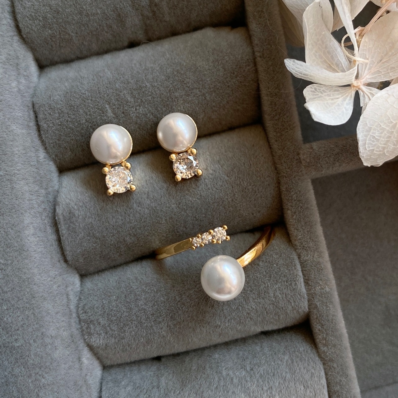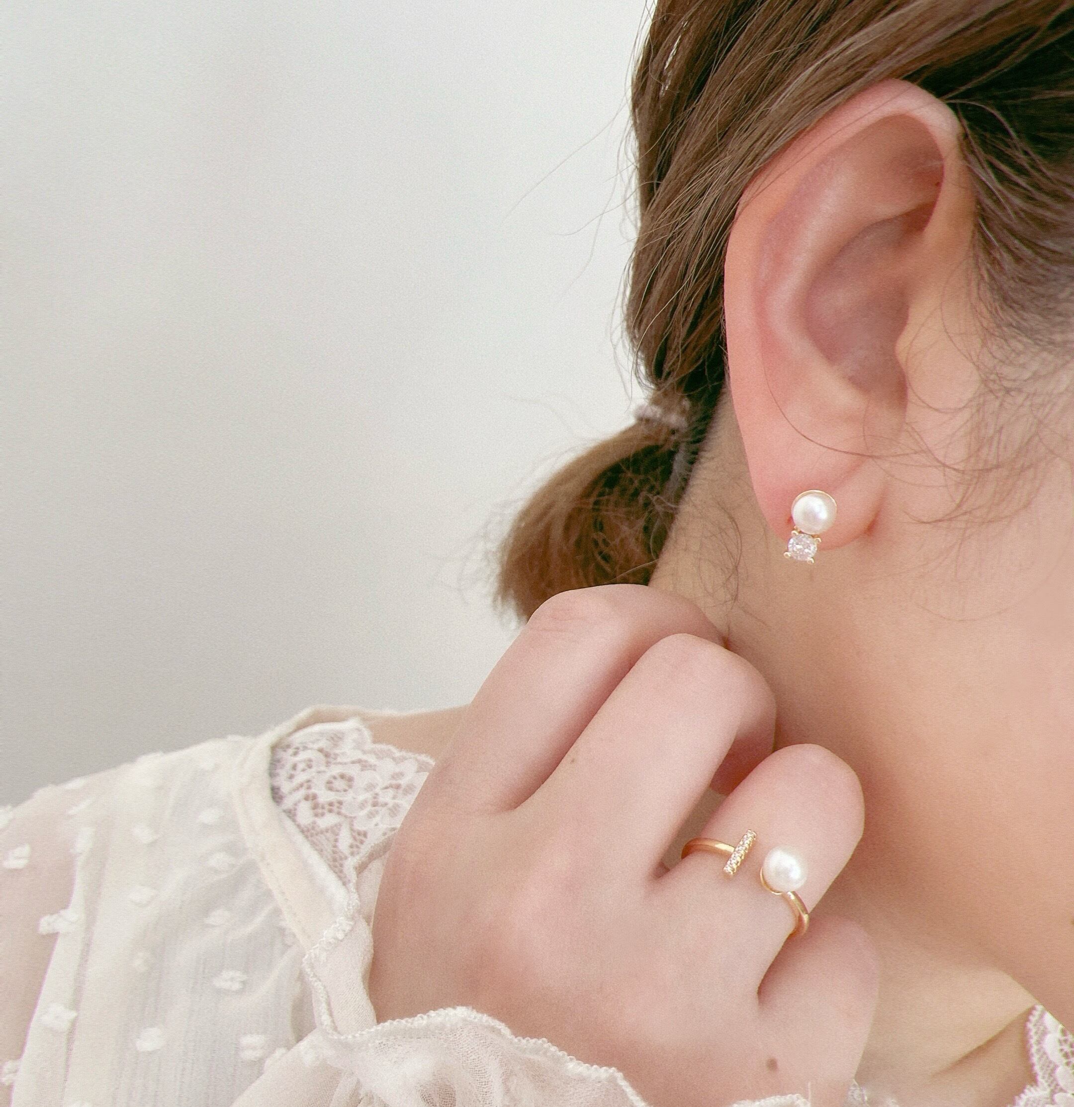 半球のコロンとしたパールがジルコニアの輝きを引き立て、上品さをプラスしてくれてます。