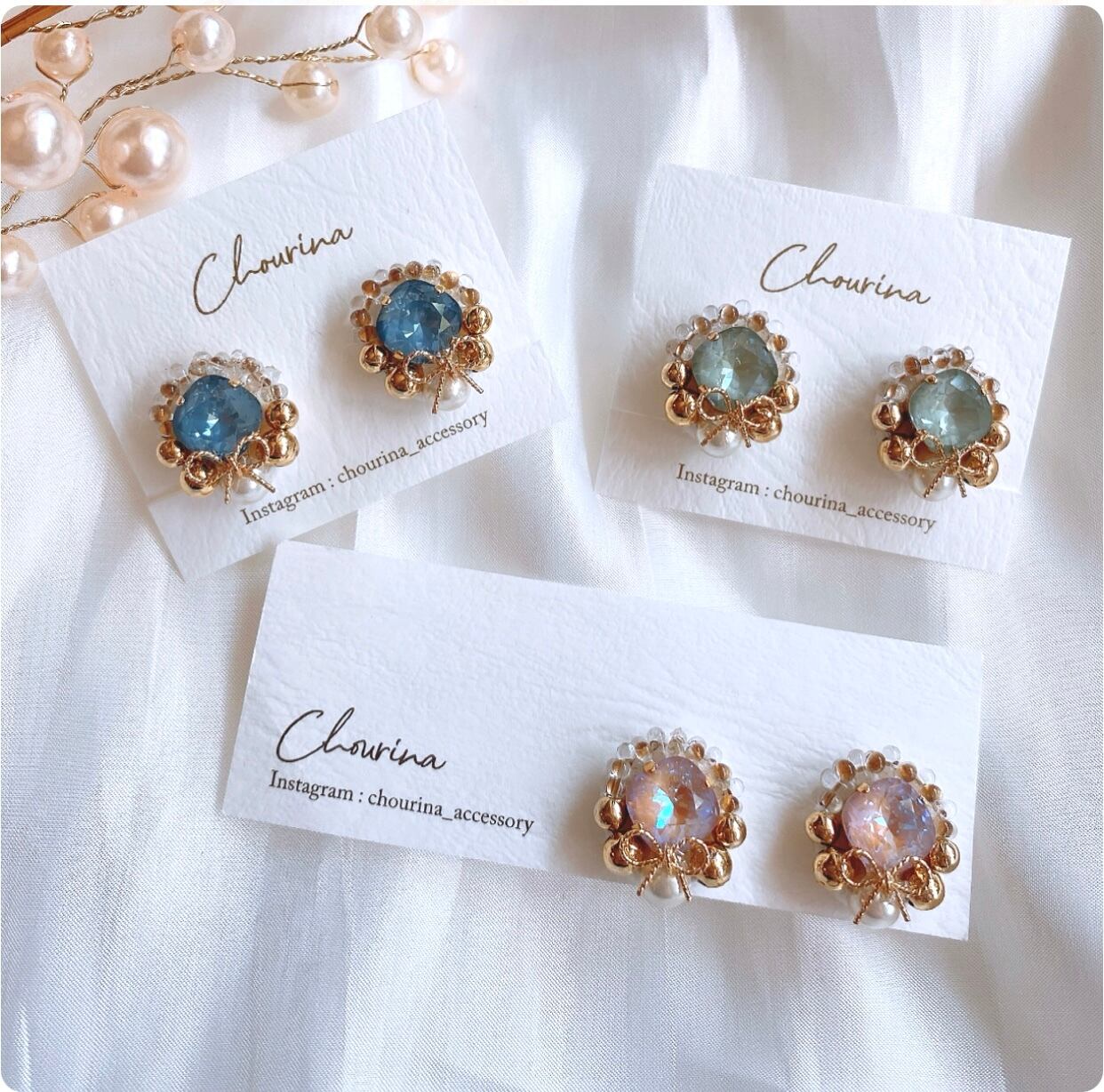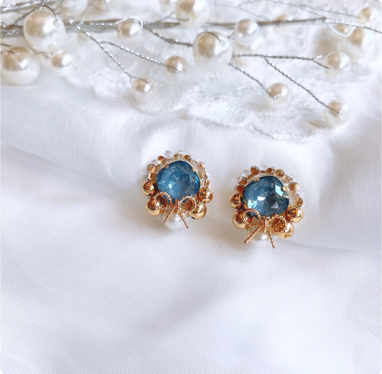そんなリボンの可愛らしさを中和する為に、大人っぽいダスティーカラーのクリスタルを合わせました。