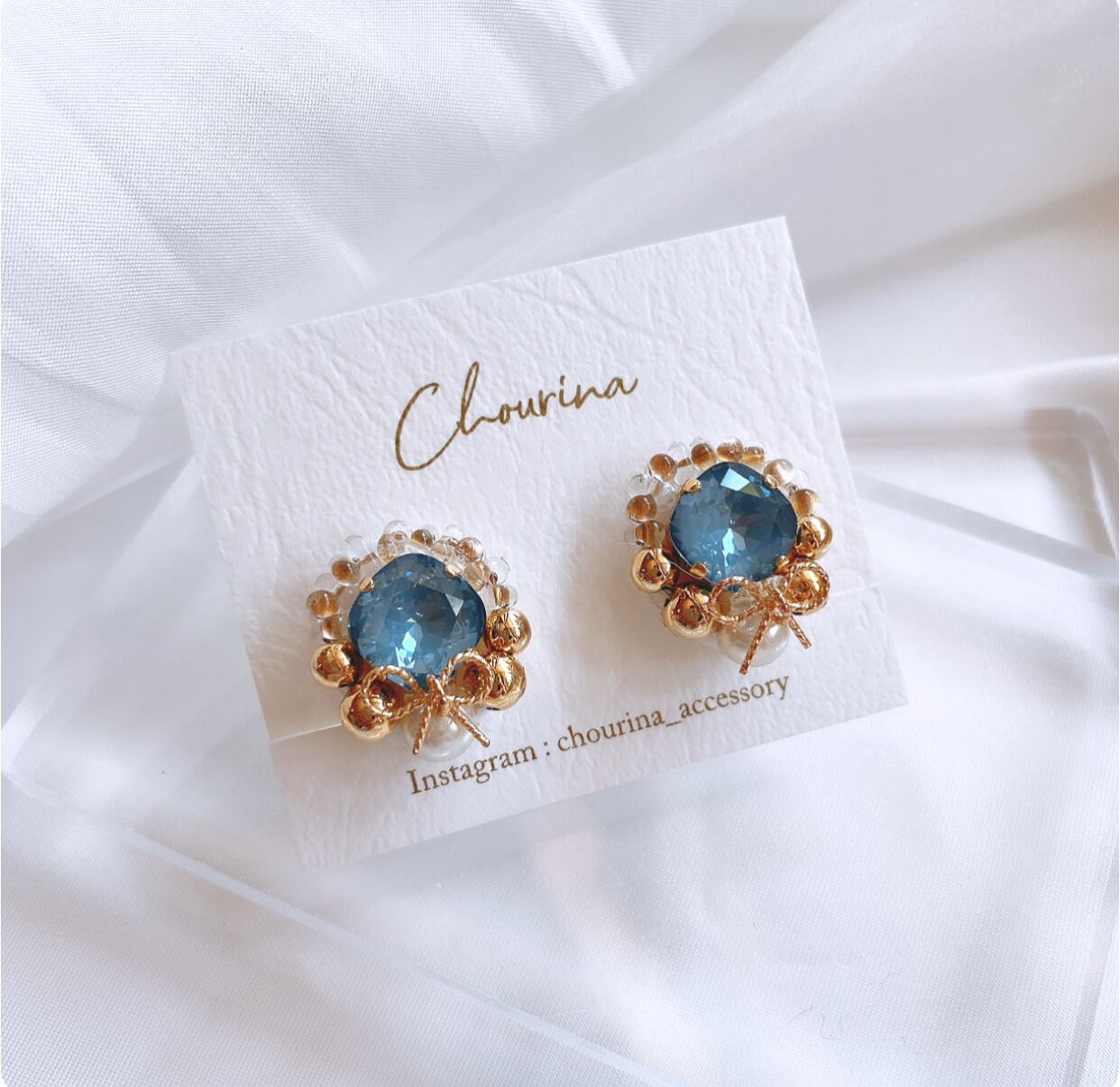 トレンドのリボンモチーフとくすみカラーのクリスタルを合わせた耳飾りです。