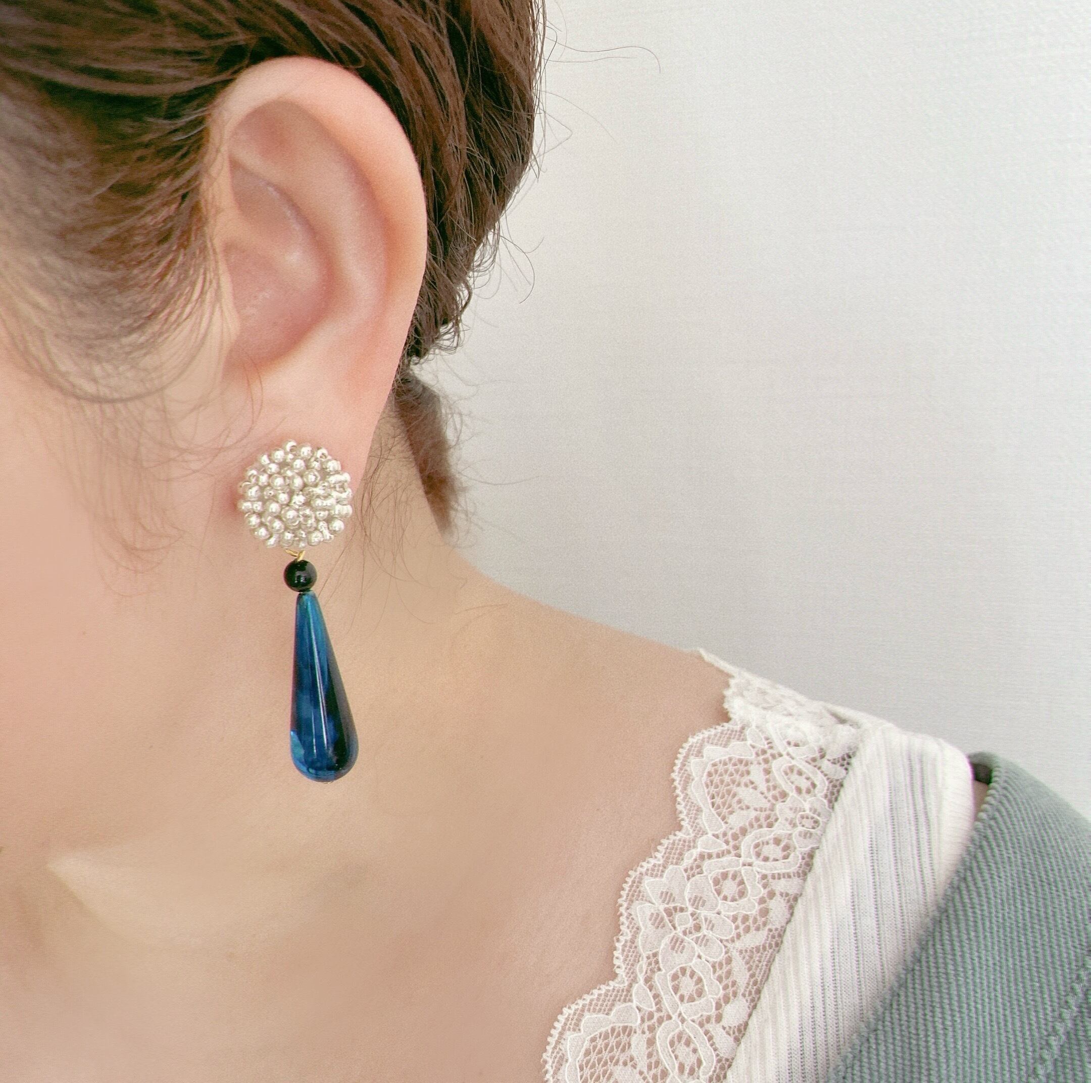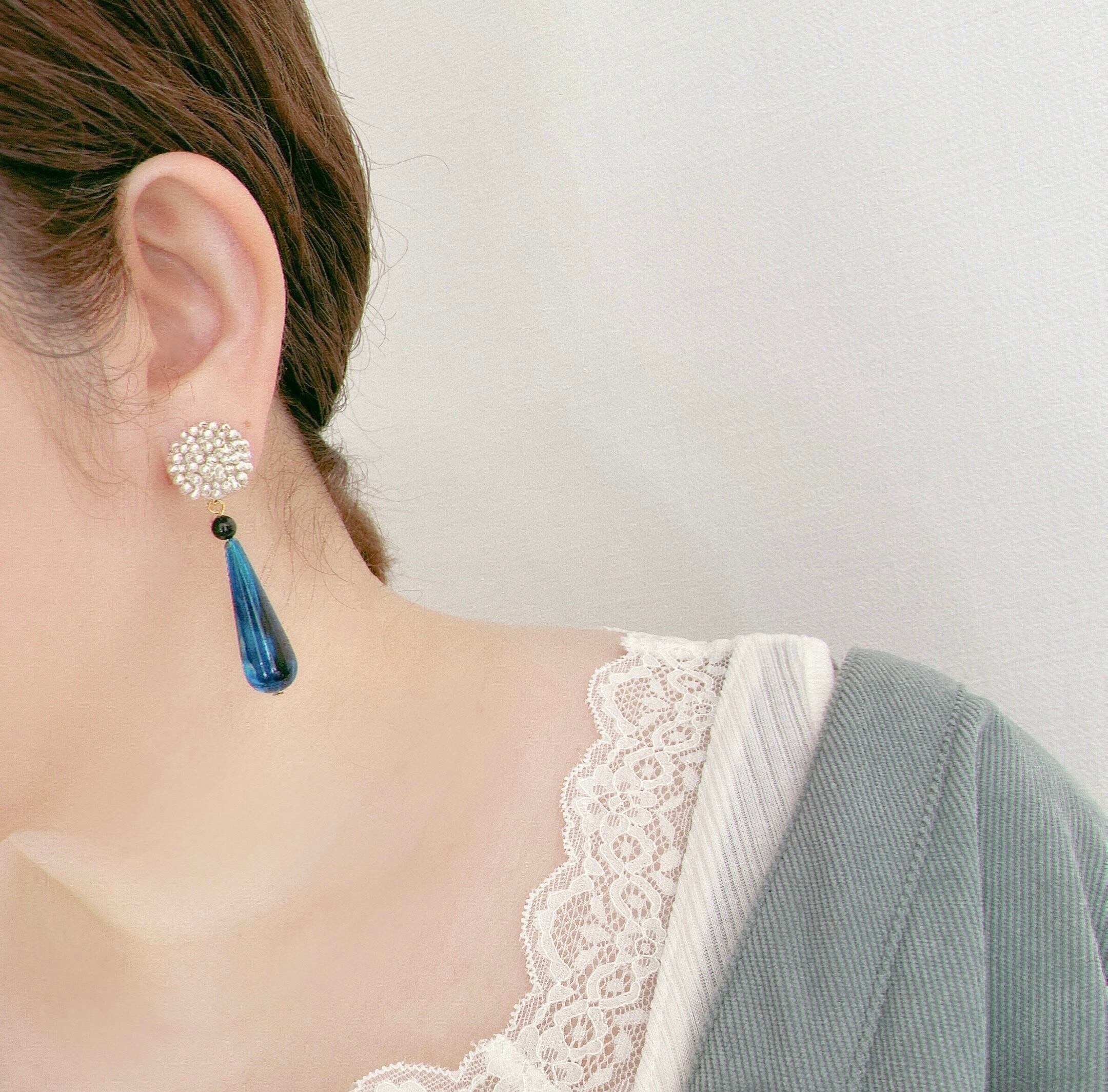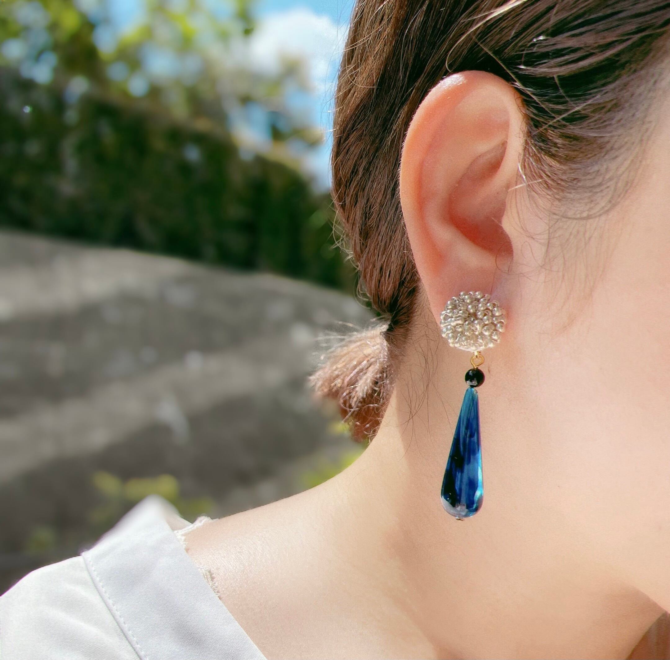 鮮やかなブルーのドロップはドイツビーズ。