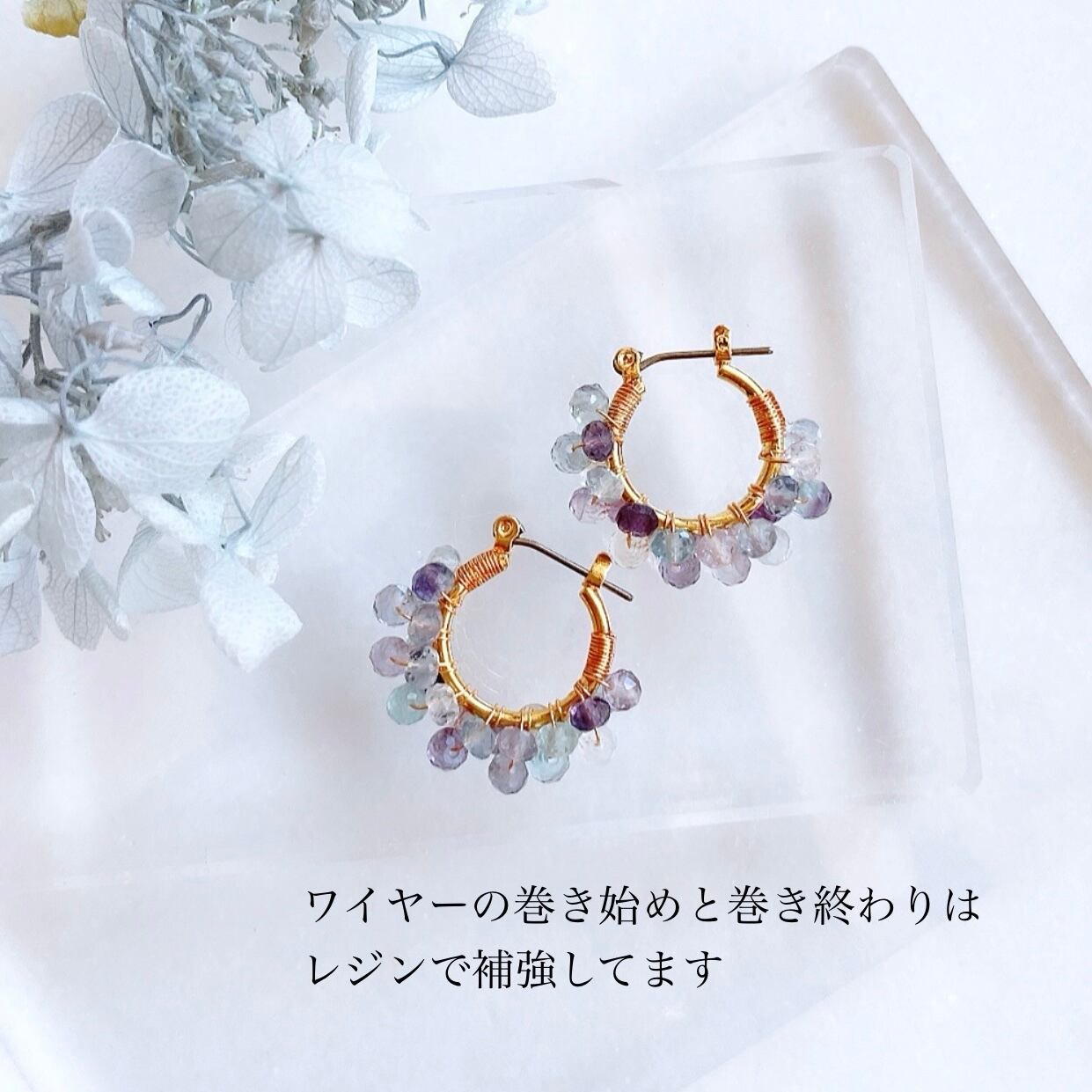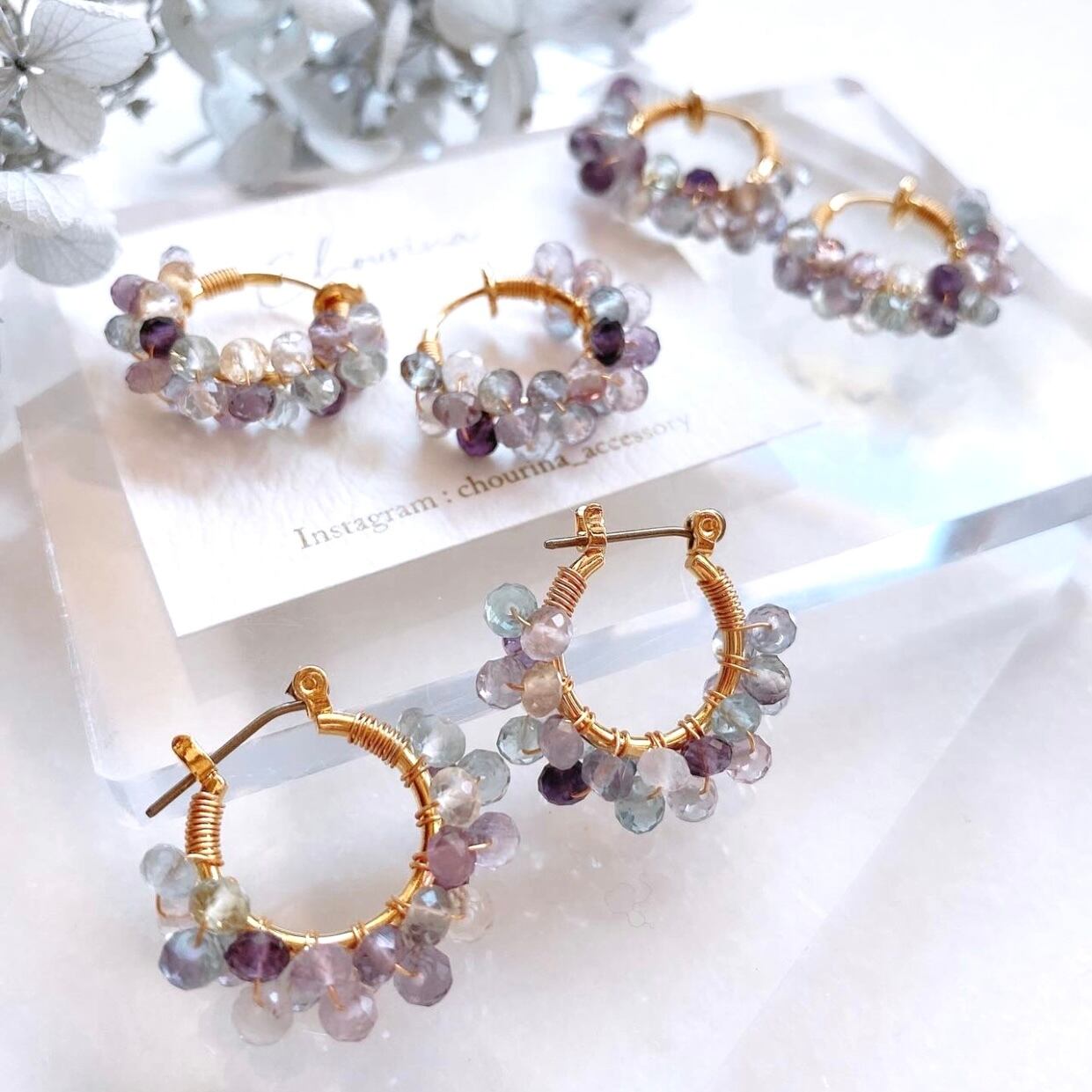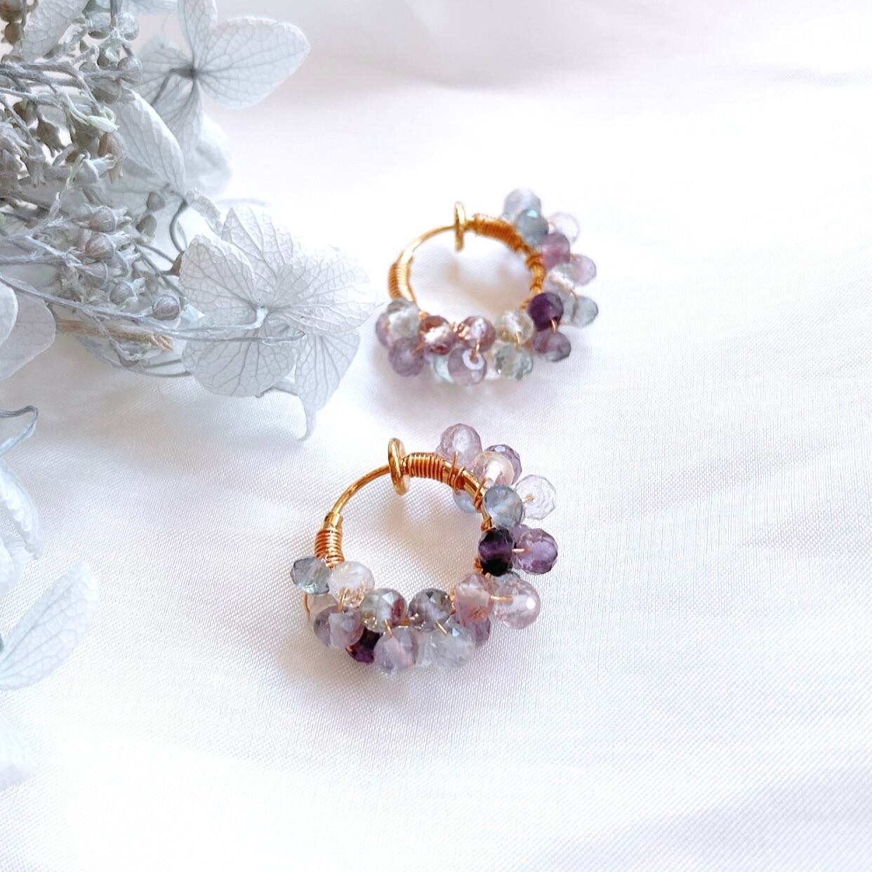 紫陽花のようなグラデーションが美しいフローライトをシンプルなフープイヤリング(ピアス)へ仕立てました。