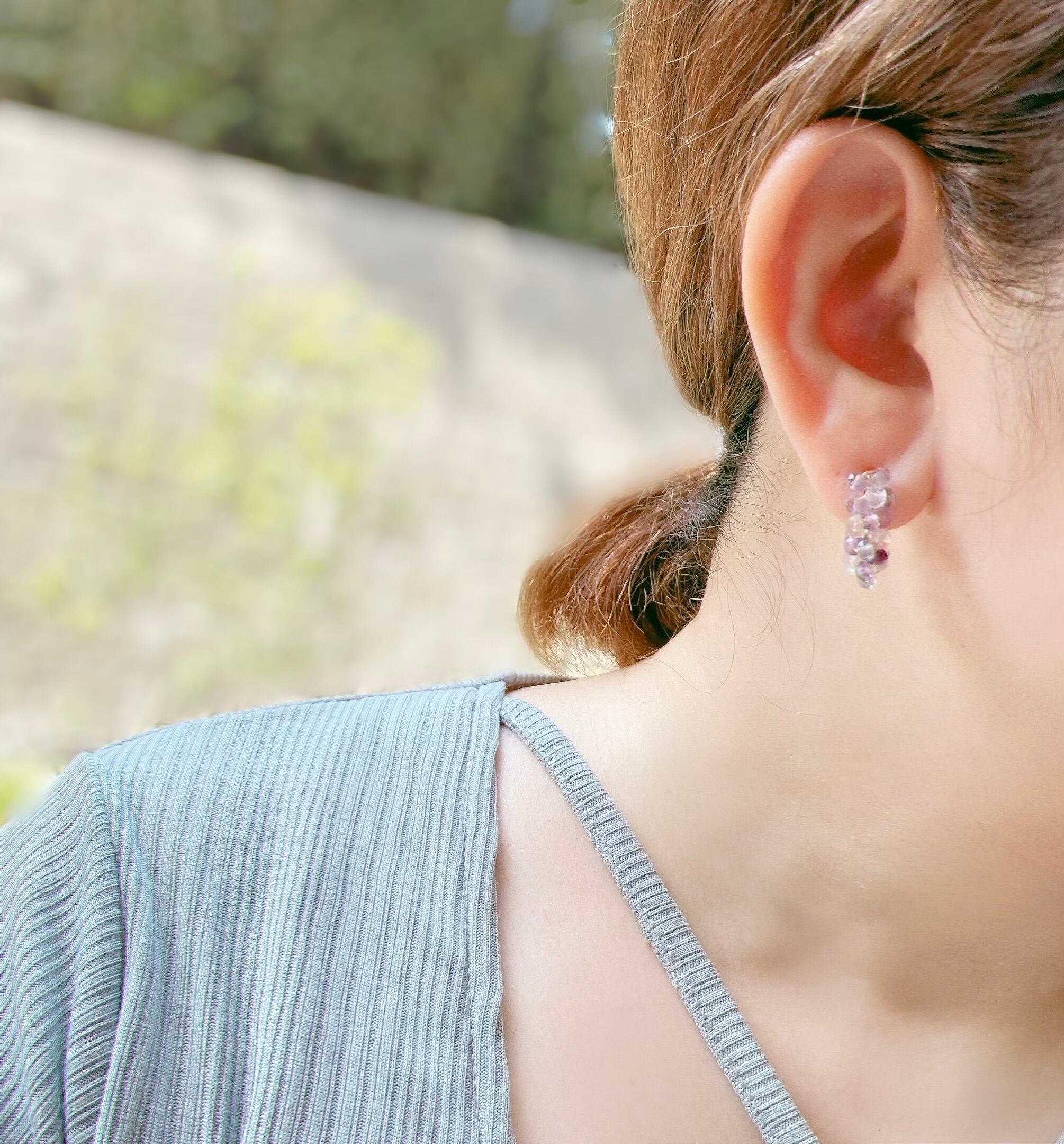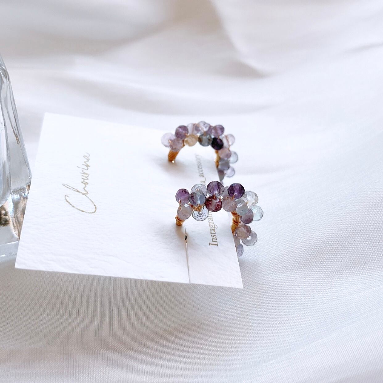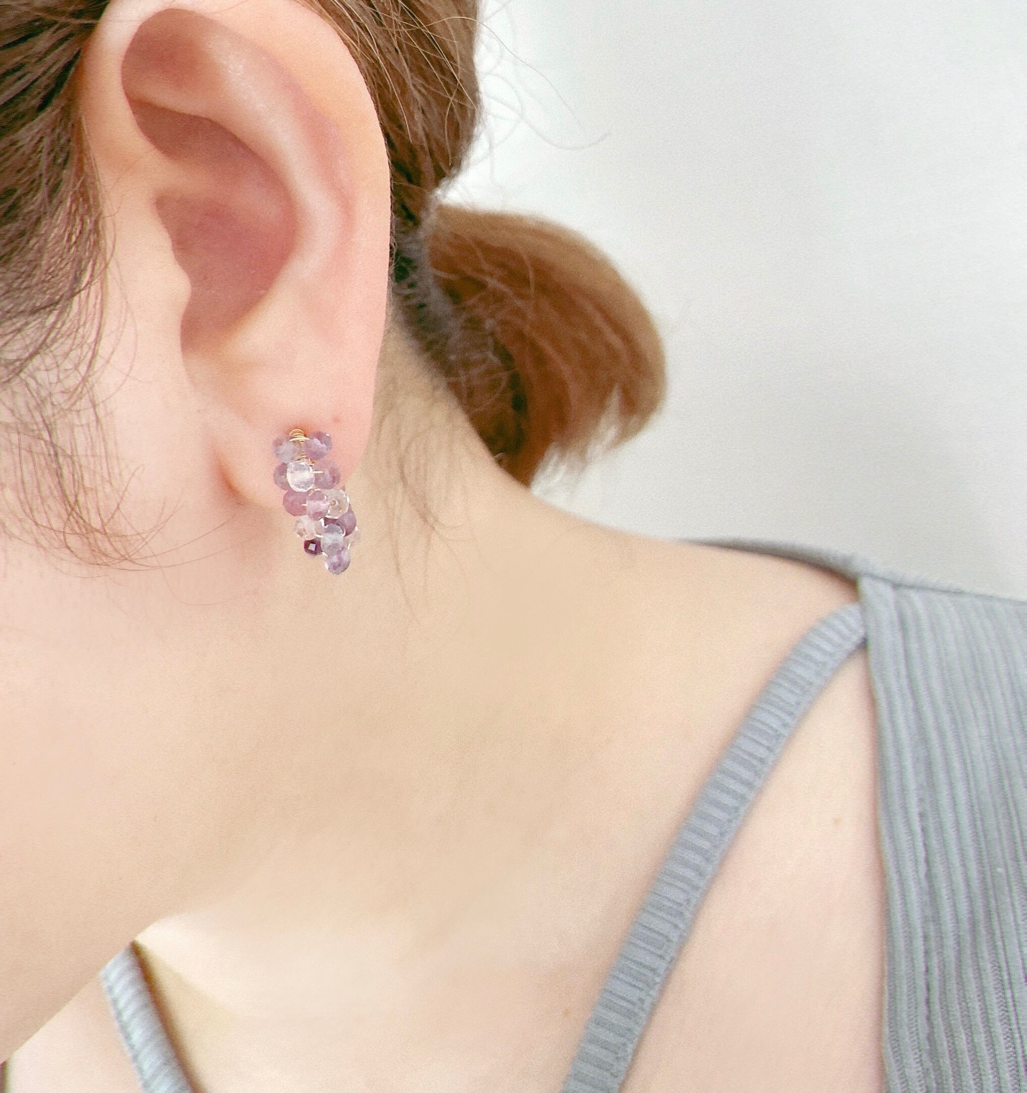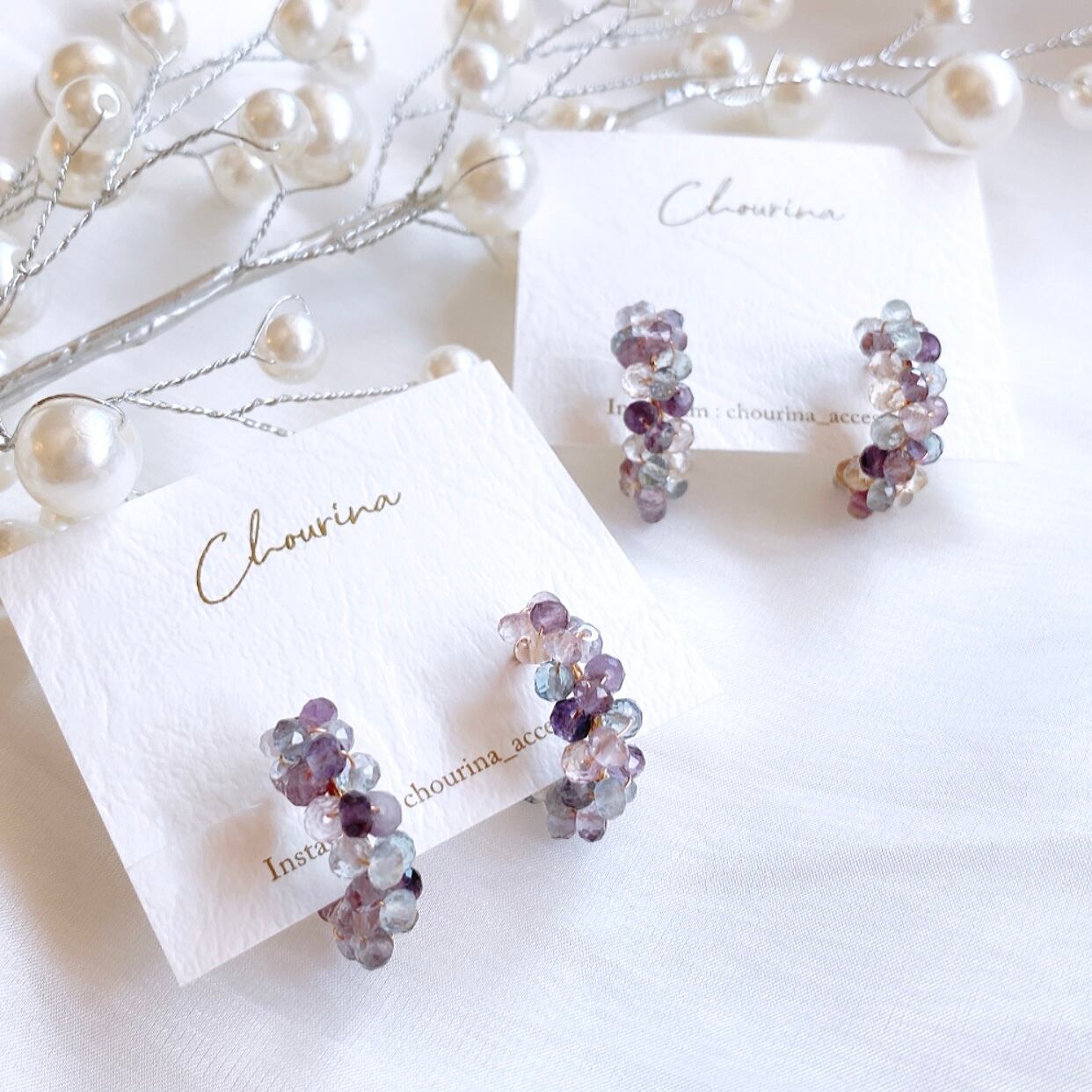 紫陽花のようなグラデーションが美しいフローライトをシンプルなフープイヤリング(ピアス)へ仕立てました。
