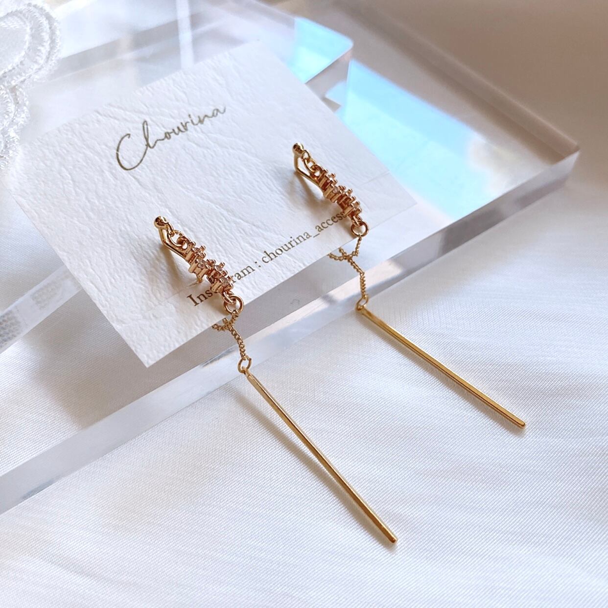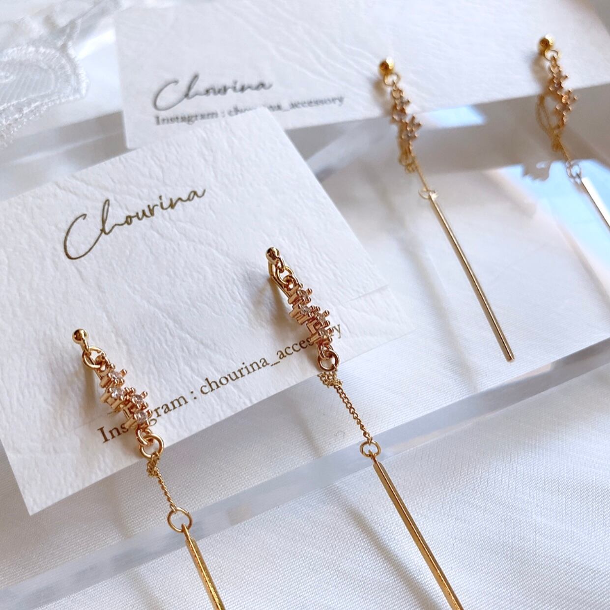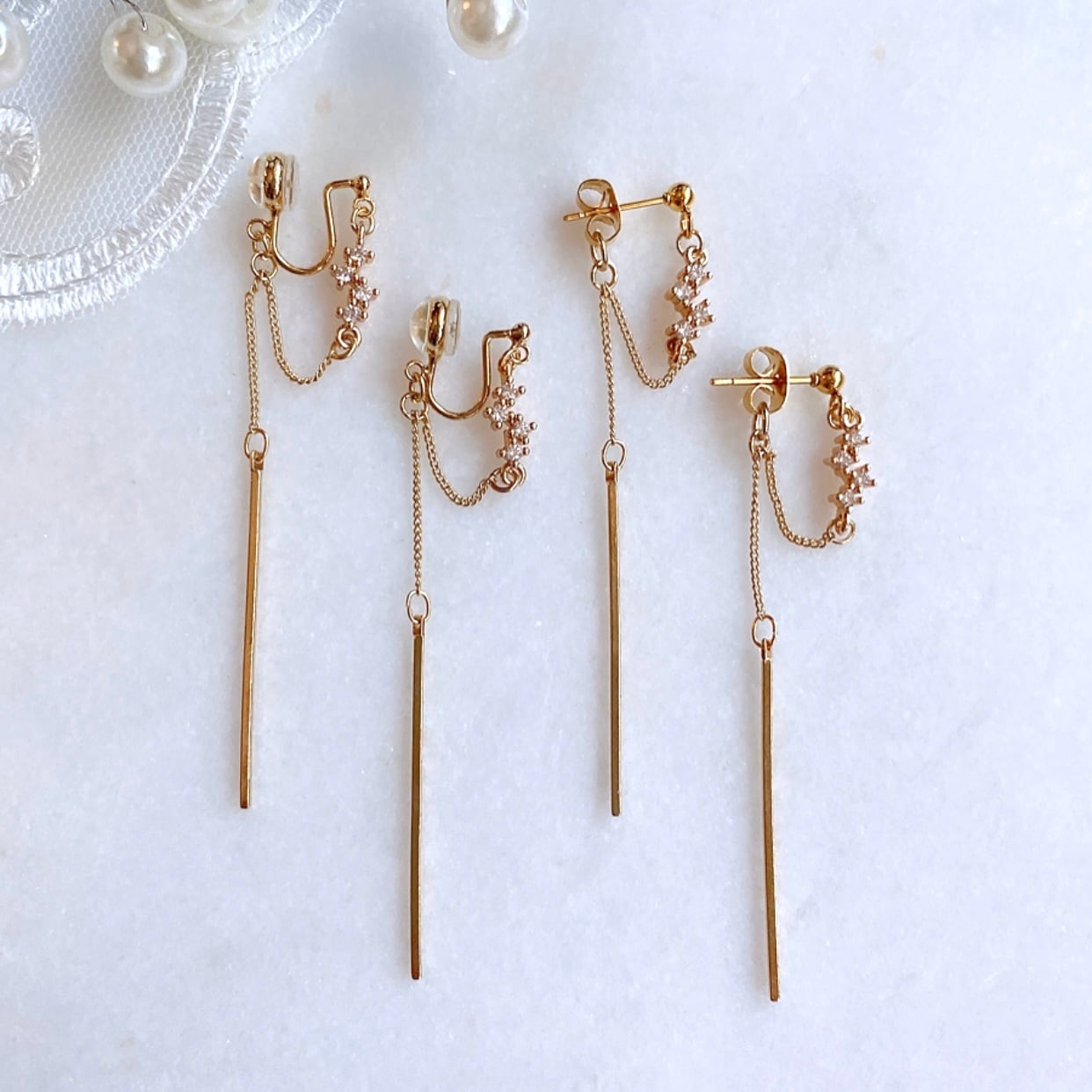 ジルコニアのチャームから耳の後ろへ繋がるようにチェーンを飾りました。