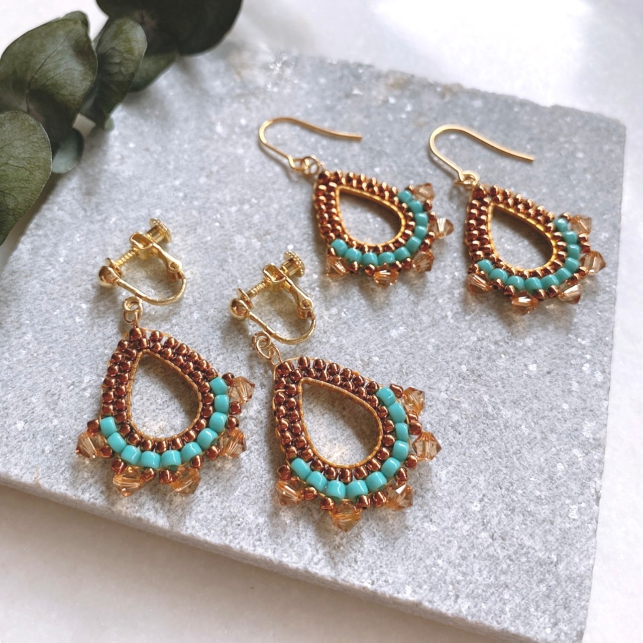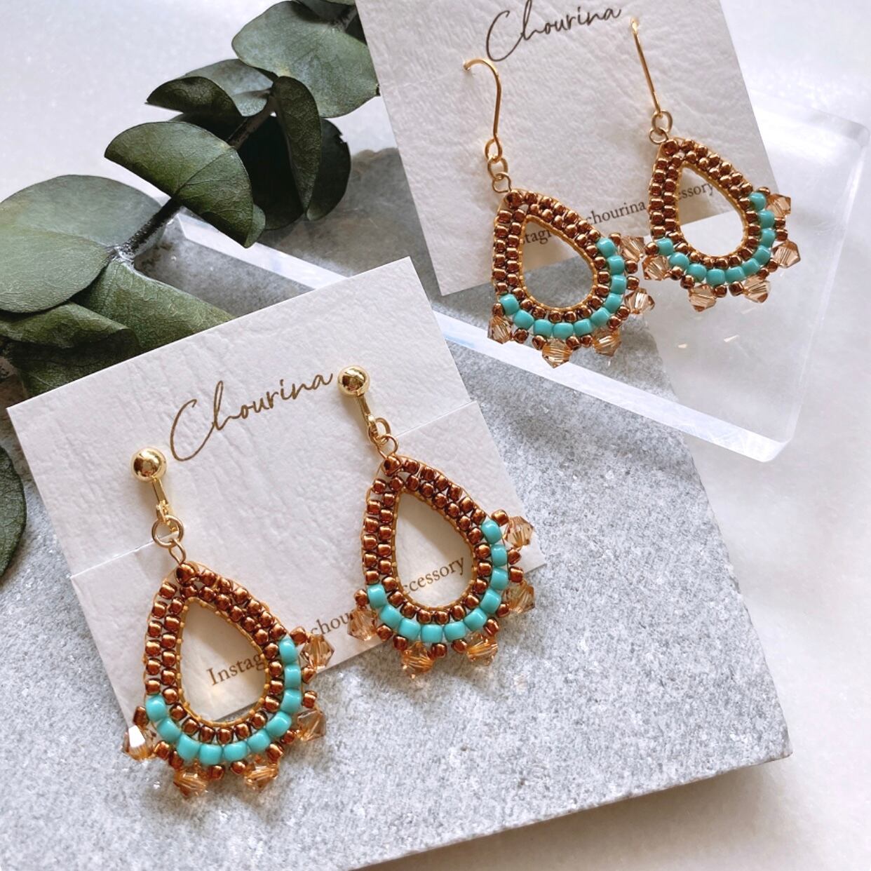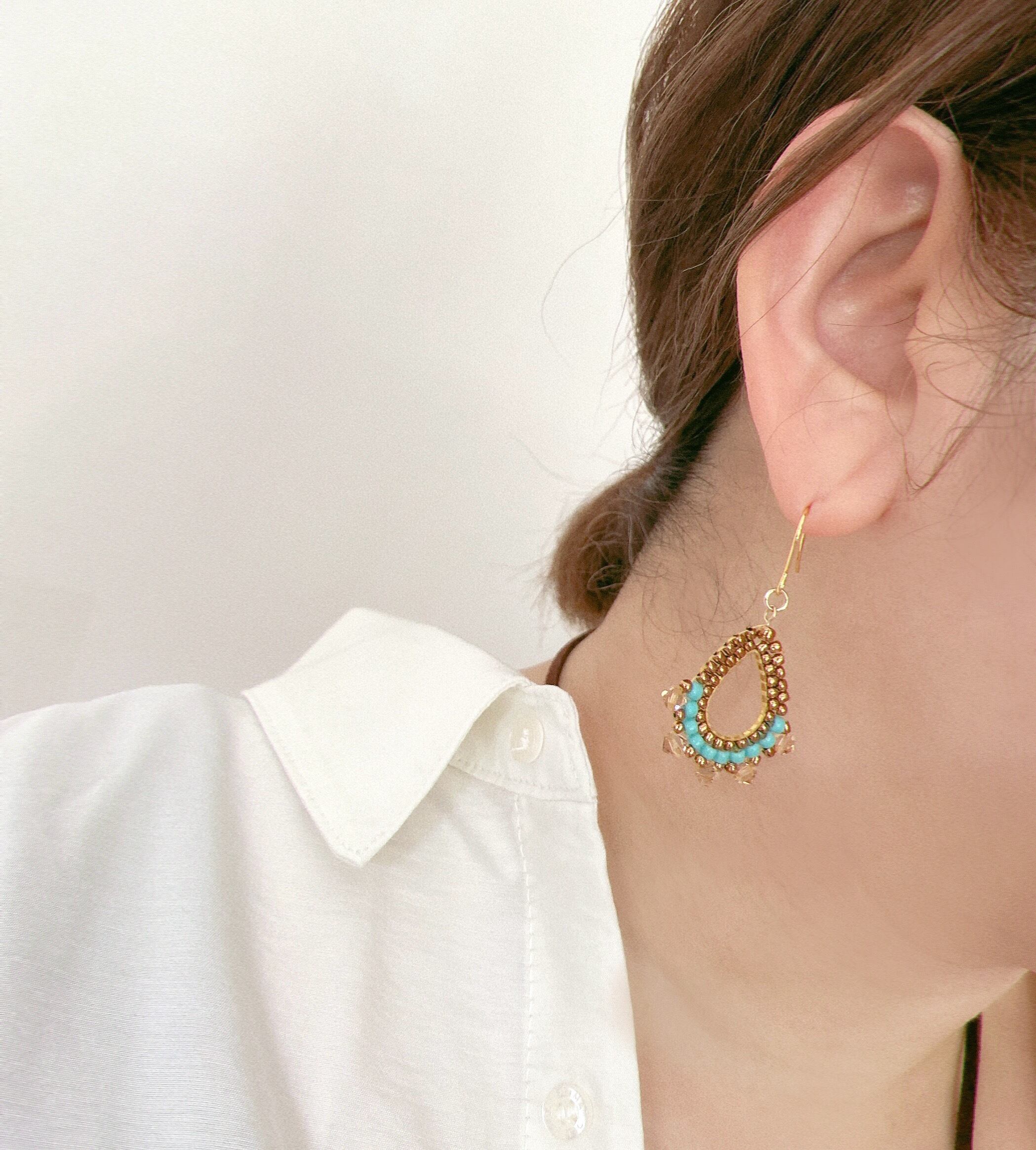 雫型のフープをベースにビーズを一粒一粒丁寧に編み込んだイヤリング/ピアス。