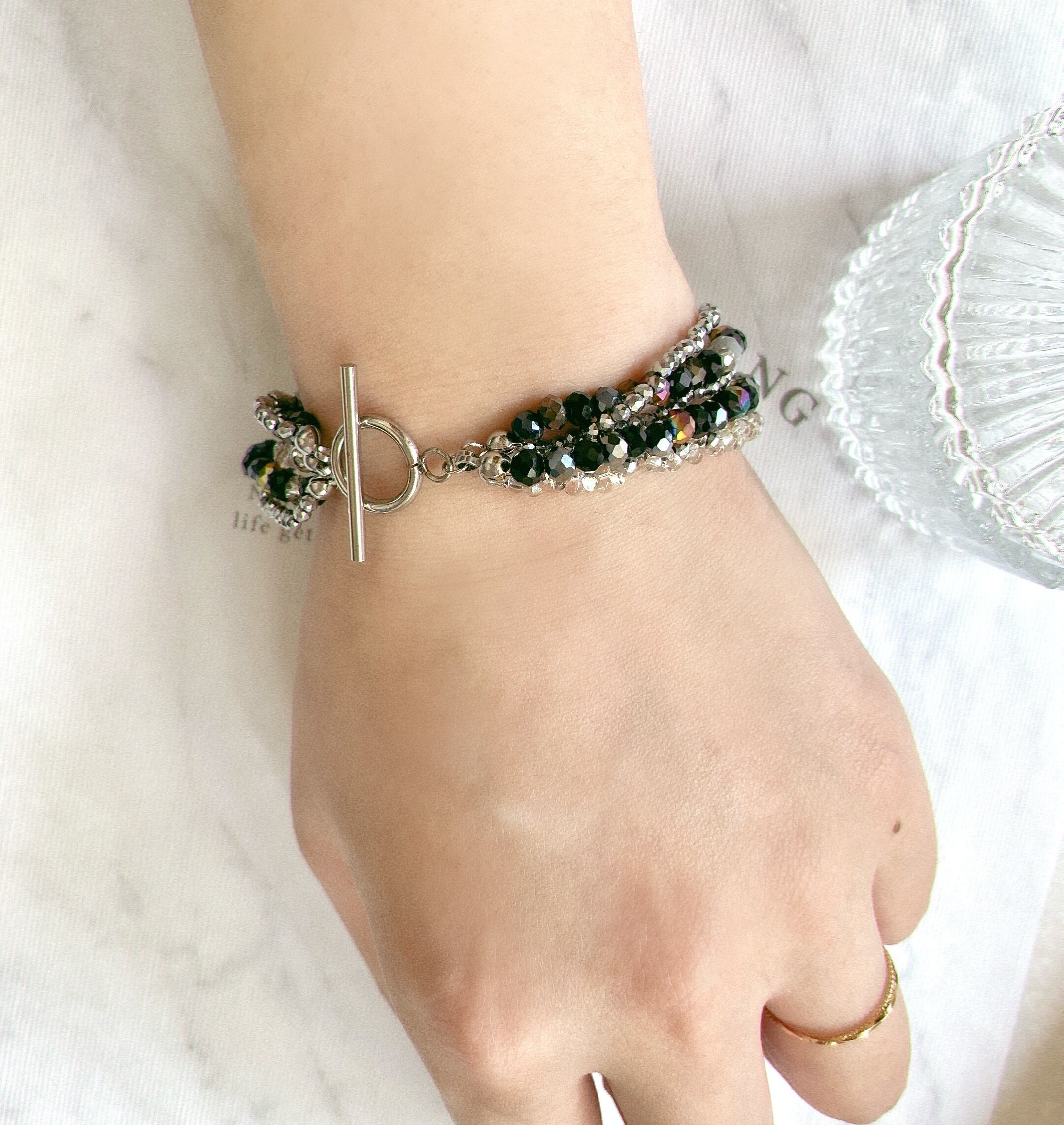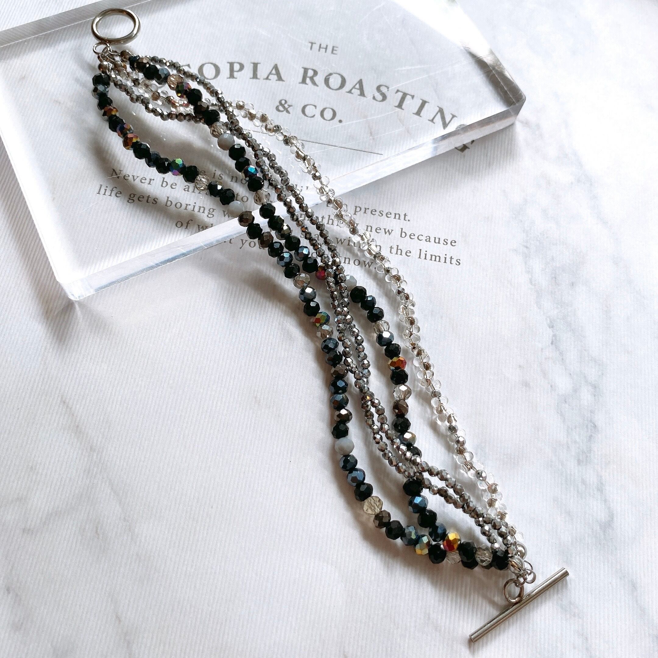 ブラックベースのチェコビーズ、ヘマタイト、ガラスビーズを合わせたボリューム感のあるブレスレットです。